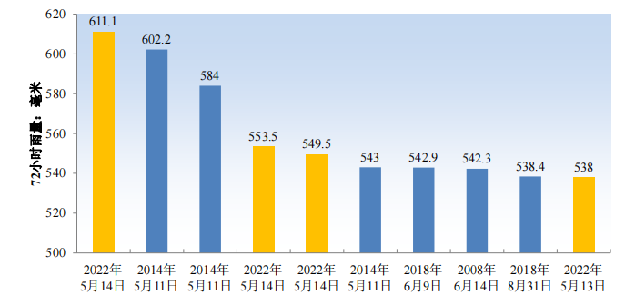 5月11-14日,受西南季风影响,深圳出现大暴雨局部特大暴雨降水,过程具有“累计雨量大、短时雨强、影响范围广”的特点,过程最大72小时雨量611.1毫米,刷新历史纪录,另有3站72小时雨量进入历史前十。