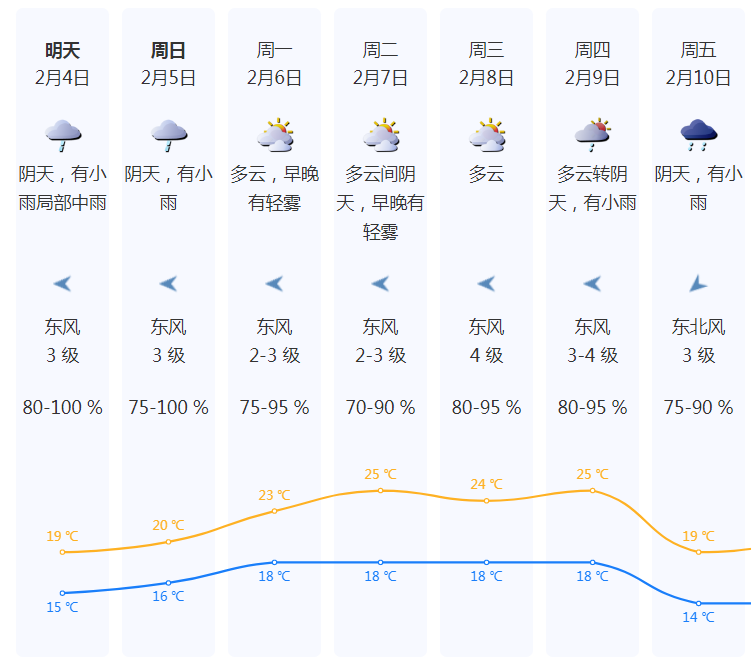 6-7日多云间阴天(可见阳光),早晚有轻雾,气温回升,天气温暖。