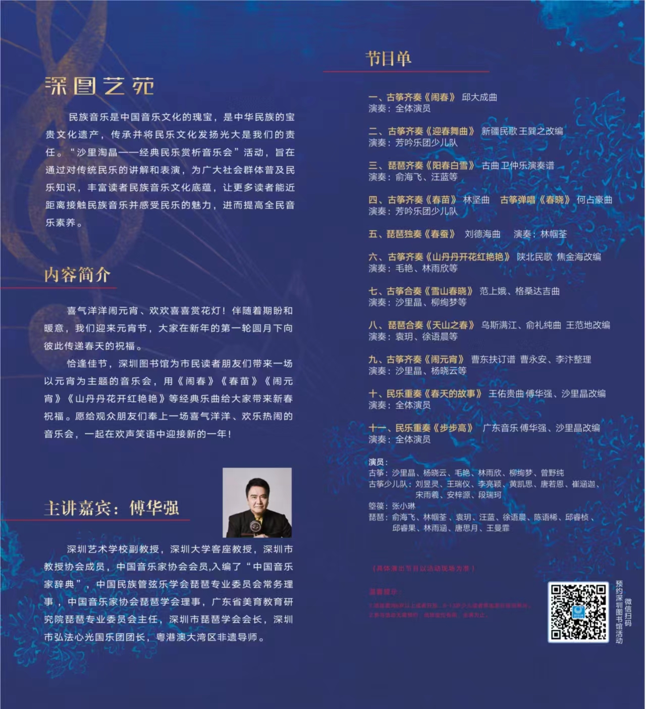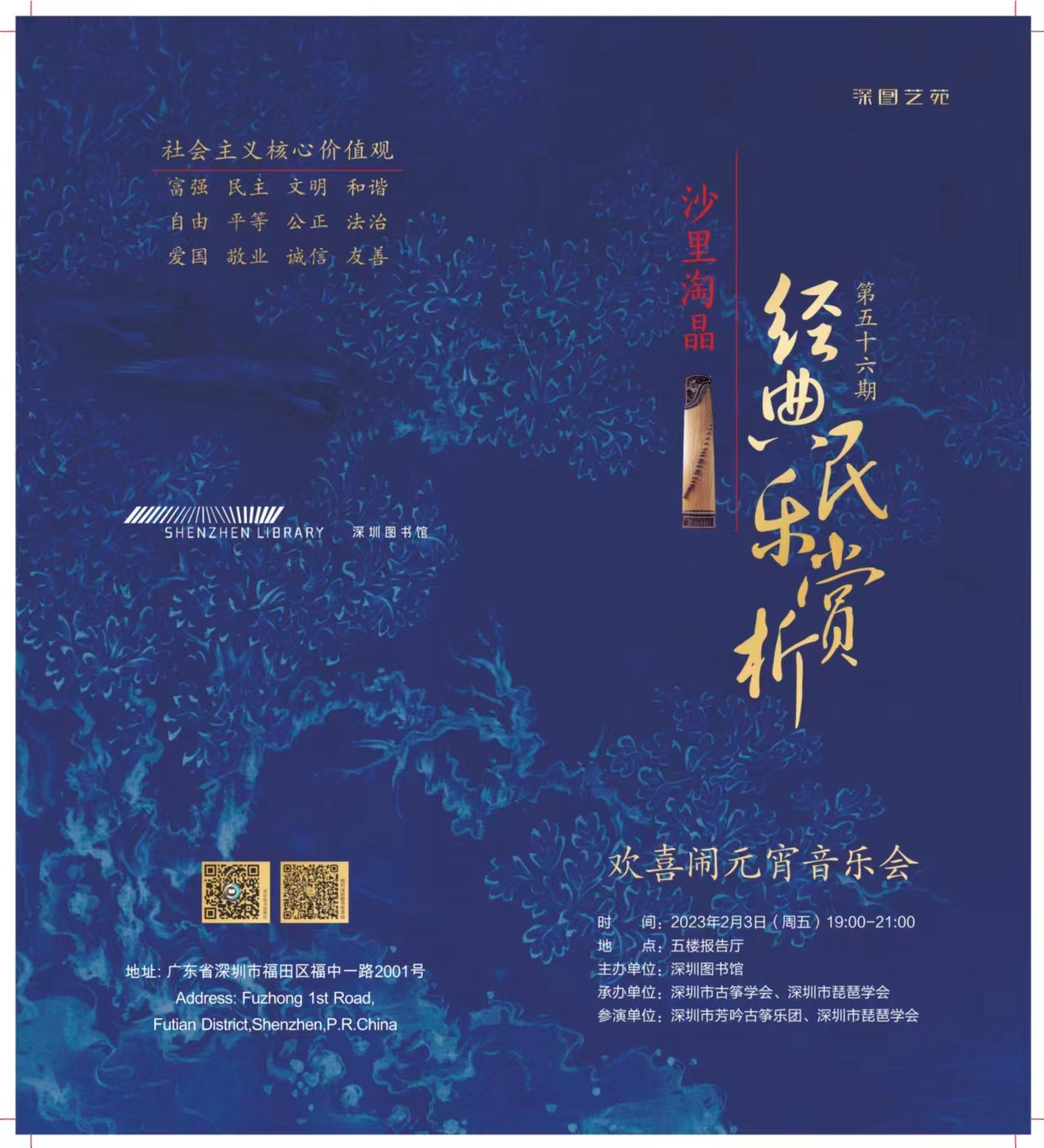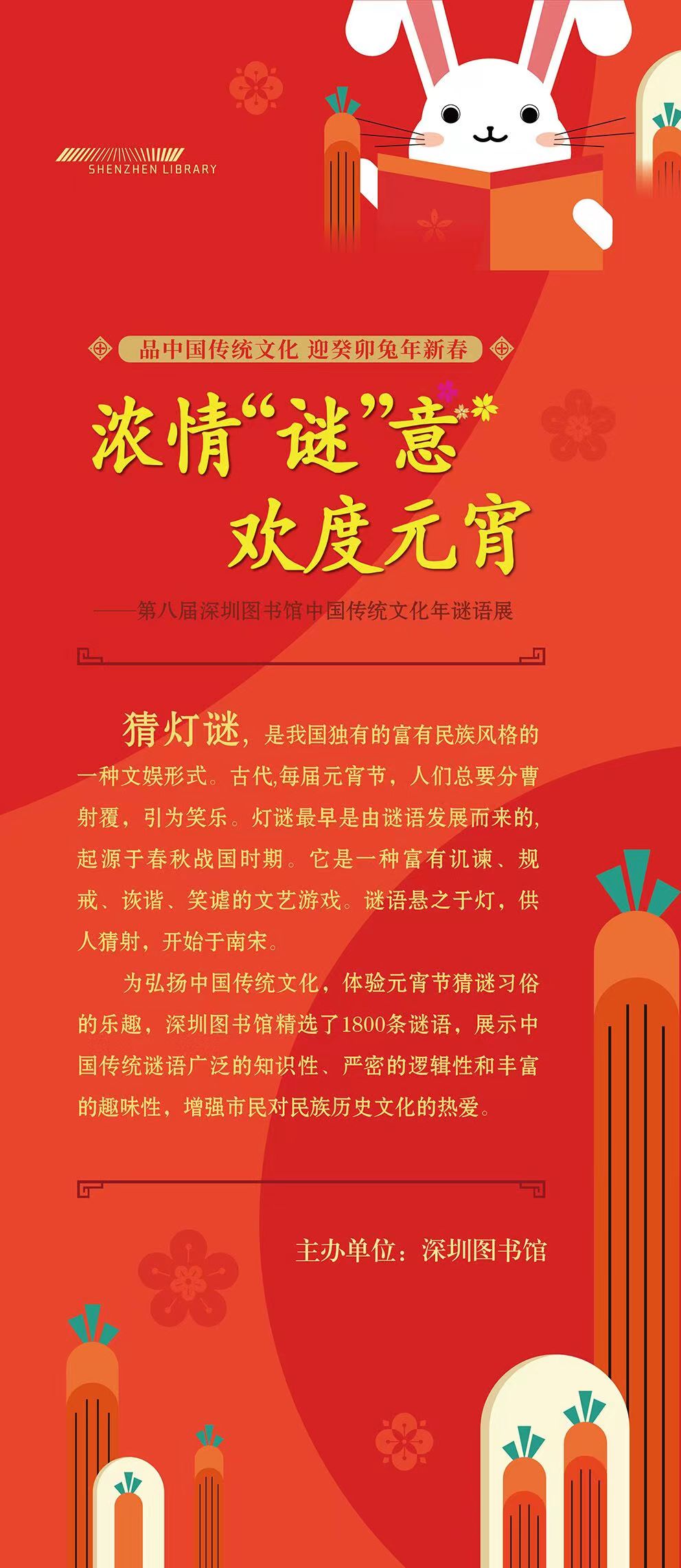 深圳图书馆特别策划了“品中国传统文化,迎癸卯兔年新春”第八届中国传统文化年系列活动。2月3日,沙里淘晶——经典民乐赏析元宵音乐会携名曲《闹春》《良宵》《百花吟》等与读者共度美好夜晚。2月4日至28日,浓情“谜”意,欢度元宵——第八届深圳图书馆中国传统文化年谜语展将亮相深图银树展厅,相邀市民读者共赏兼具知识性和趣味性的1800条谜语。此外,在深图少儿服务区,小朋友还可以进行“欢度元宵 书海寻宝”的趣味活动,根据图书关键词解锁相应图书可获得纪念品。