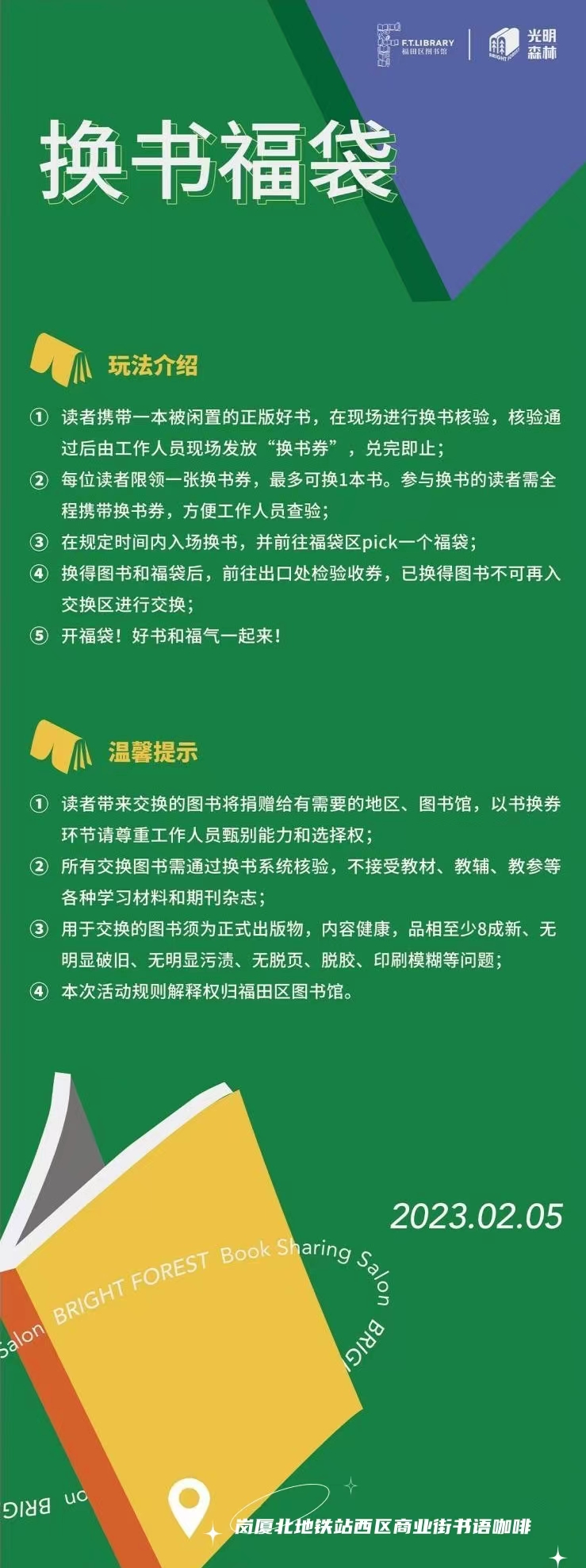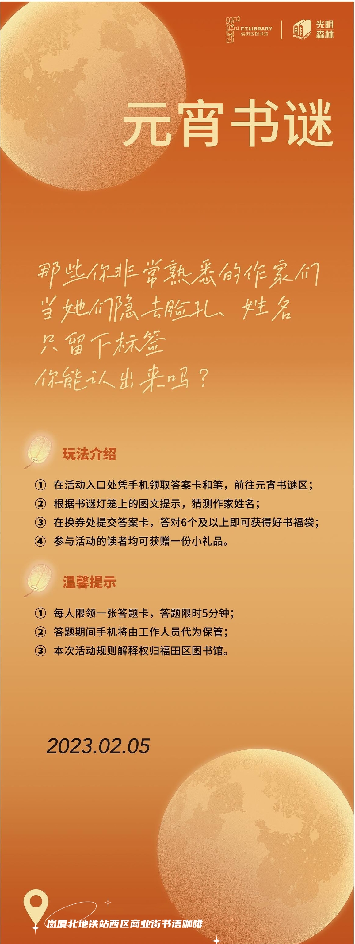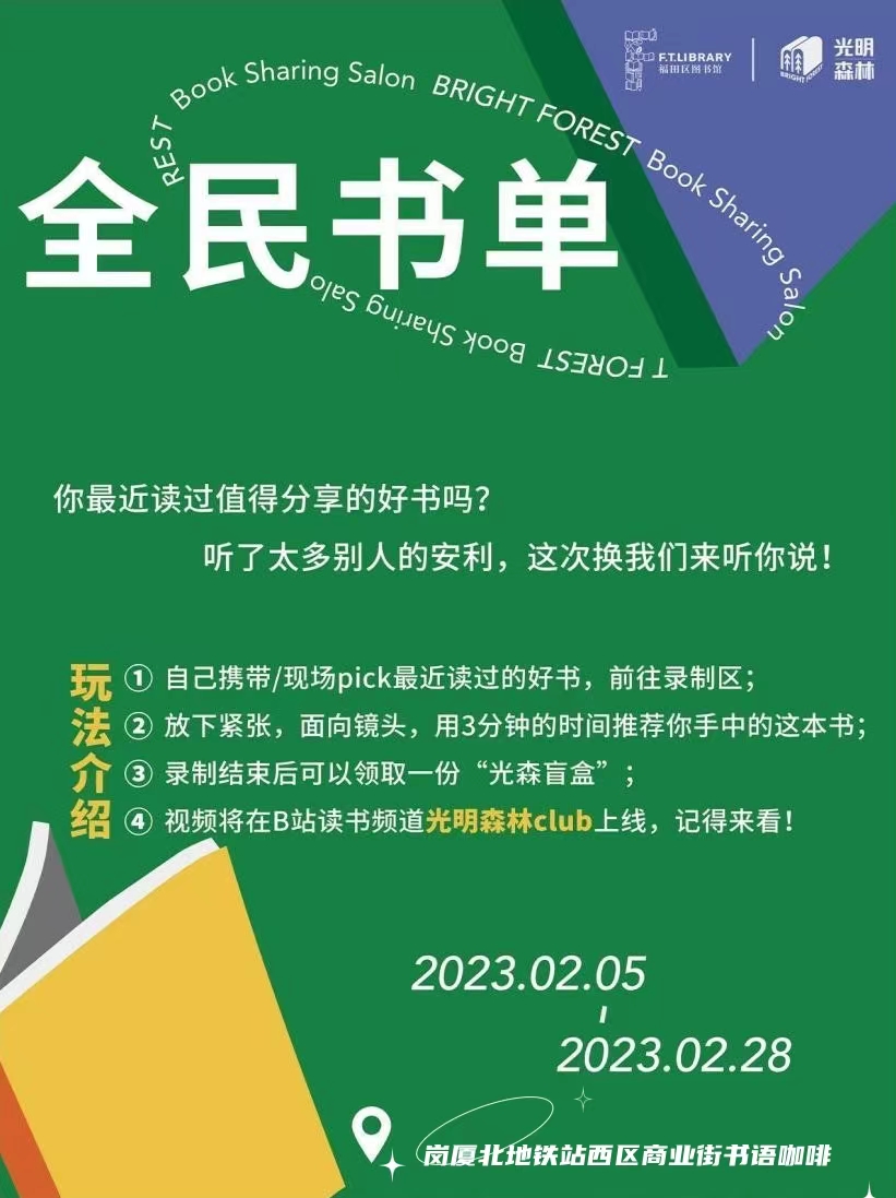 位于岗厦北交通枢纽的“福田library+书语咖啡”快闪图书馆以多元文化元素陪伴读者欢度佳节。本周日,“元宵书谜”和“换书福袋”活动将与市民见面,除了根据灯谜猜作家名字赢取好书福袋以外,读者携带一本被闲置的正版好书,在规定时间内入场换书,即可领取一个福袋开惊喜。“全民书单”活动也将于当天上线并持续至2月28日,在此期间,“书语”咖啡空间设置了录制点,喜欢阅读的朋友可前往录制最近读过的好书,视频将在B站读书频道“光明森林club”上线,与更多人分享阅读心得。