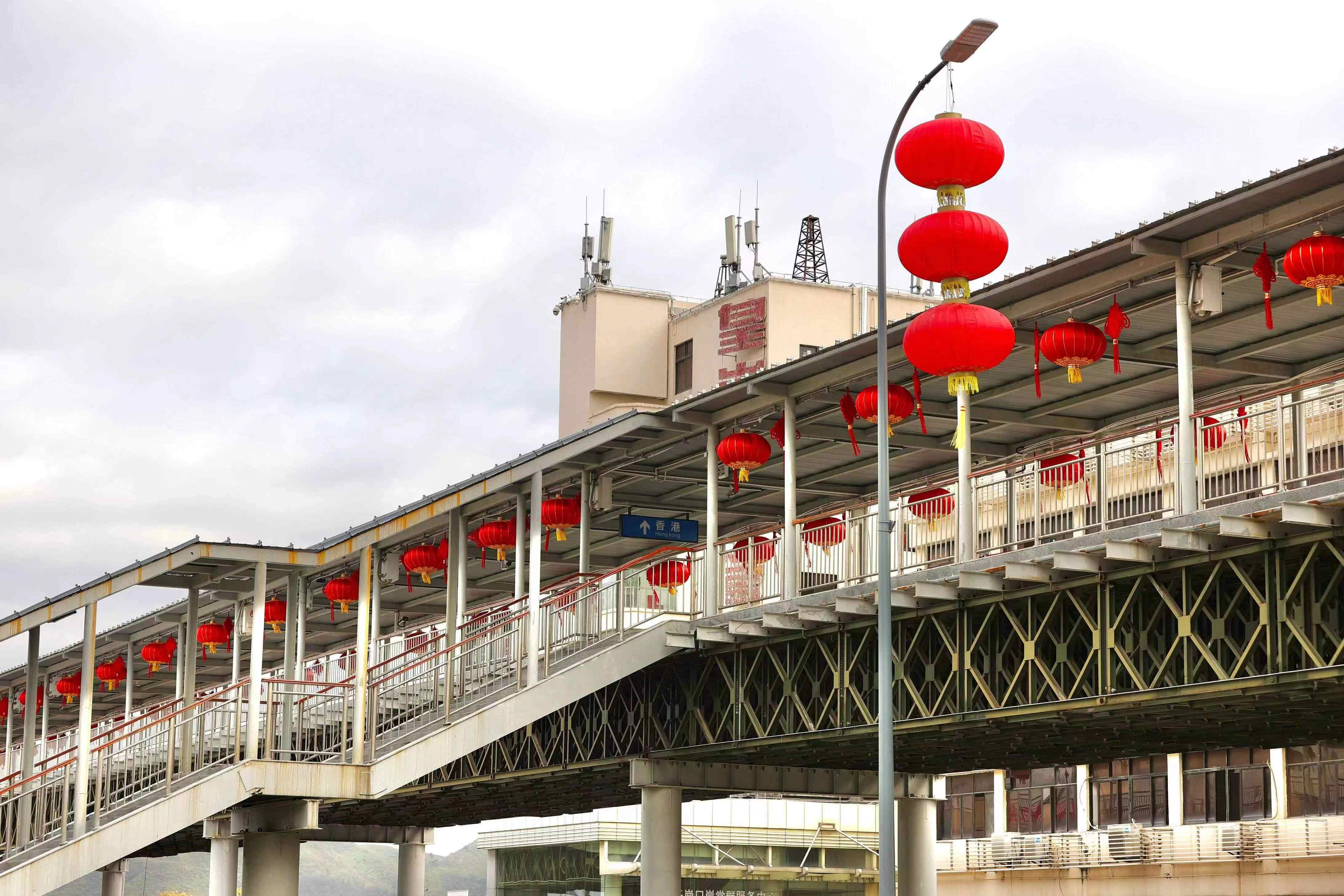 深圳皇岗口岸通往联检大楼的桥上挂满红灯笼和中国结