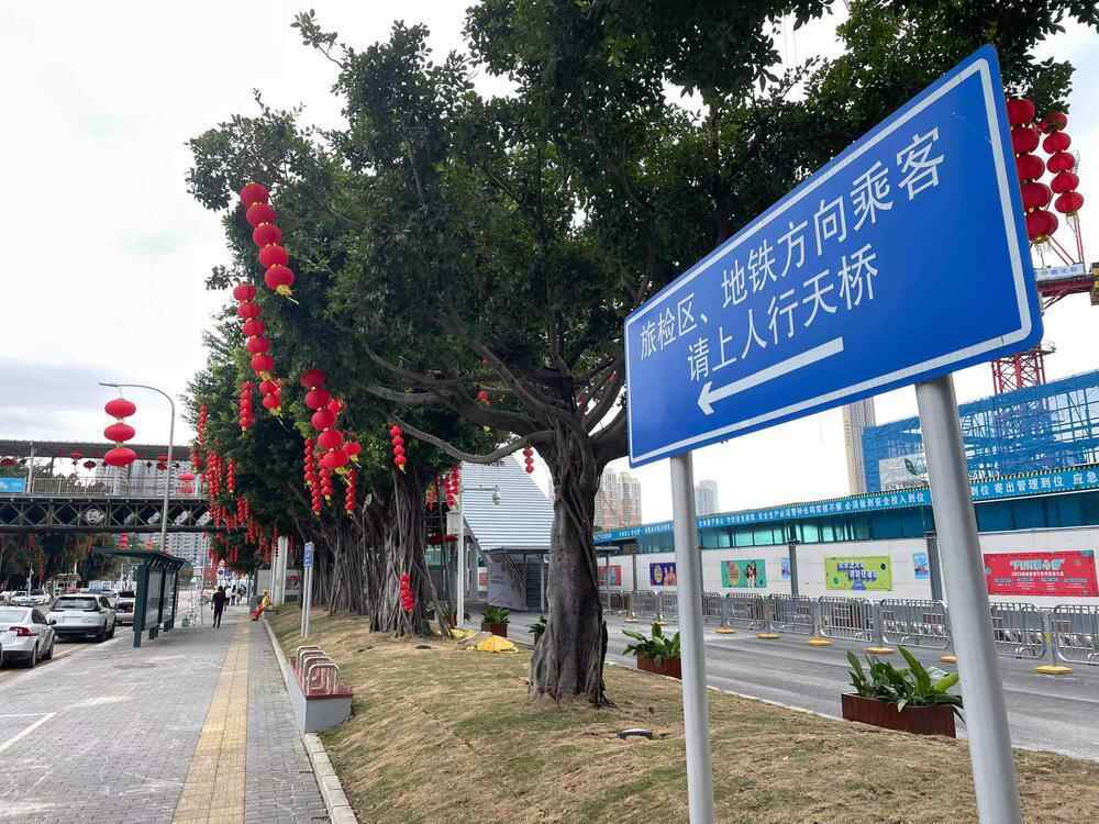 2月3日下午,记者来到位于深圳市福田区的皇岗口岸,由于还未通关,现场人流、车流较少,施工工人正加紧布置通关所用的设施,口岸旁边的行道树上挂满了红灯笼,现场喜庆祥和,节日气氛浓厚。附近的施工围墙上贴着“湾区返埋嚟”“we are family ”“欢迎香港同胞返深”等标语。