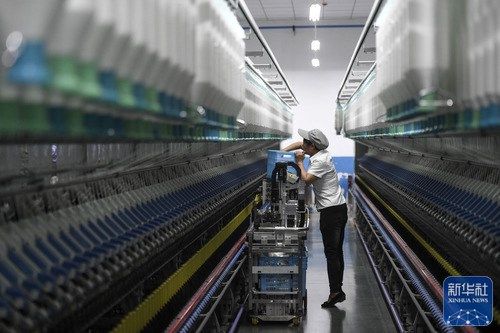 在位于固原市经济技术开发区的宁夏丰源纺织厂,工人在机台上忙碌(5月18日摄)。新华社发(冯开华 摄)
