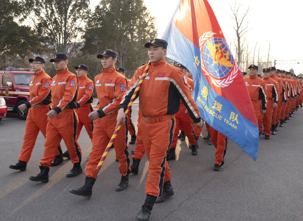 2月7日,中国救援队队员在北京大兴消防训练基地准备出发。新华社记者 彭子洋 摄