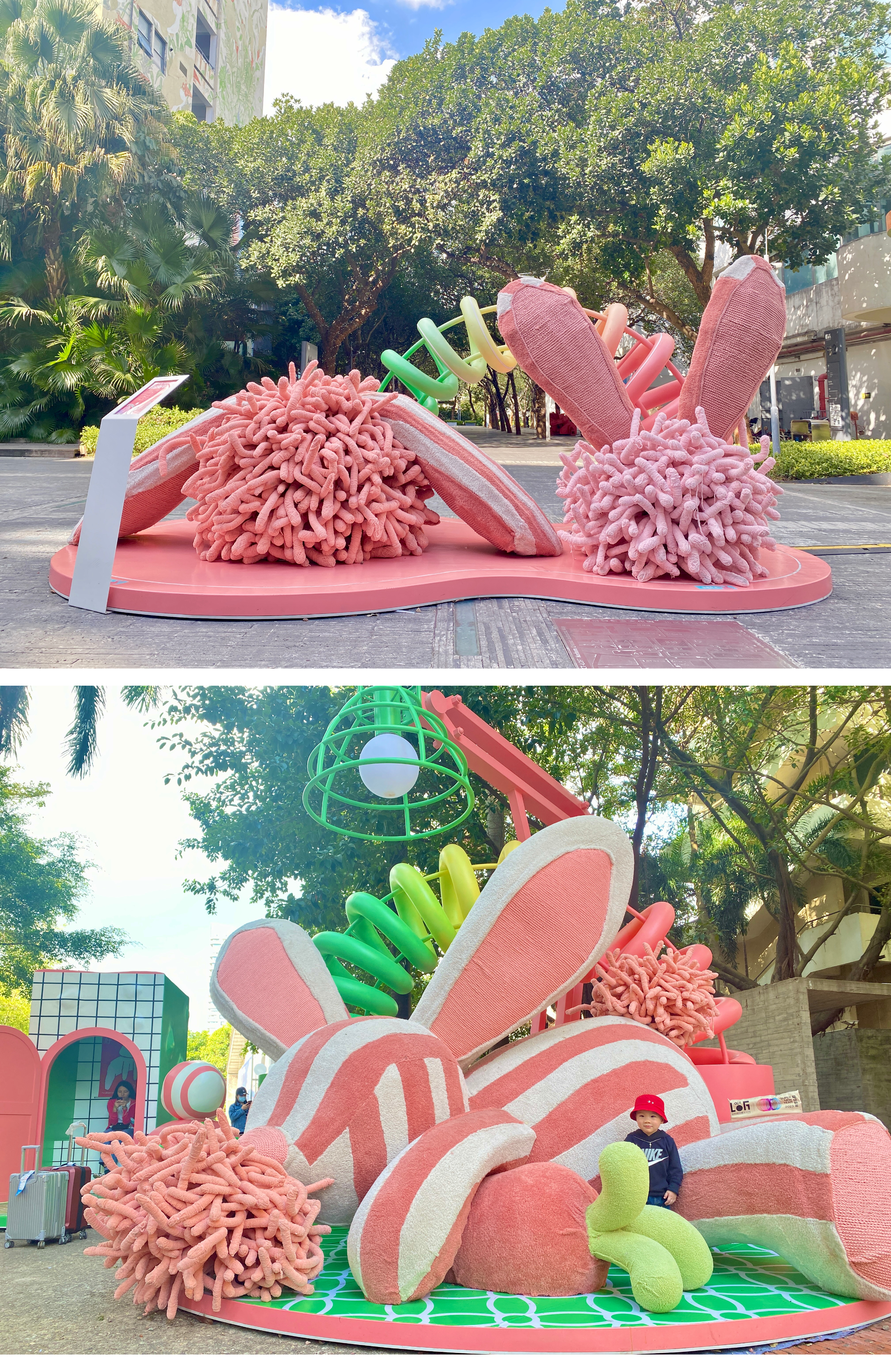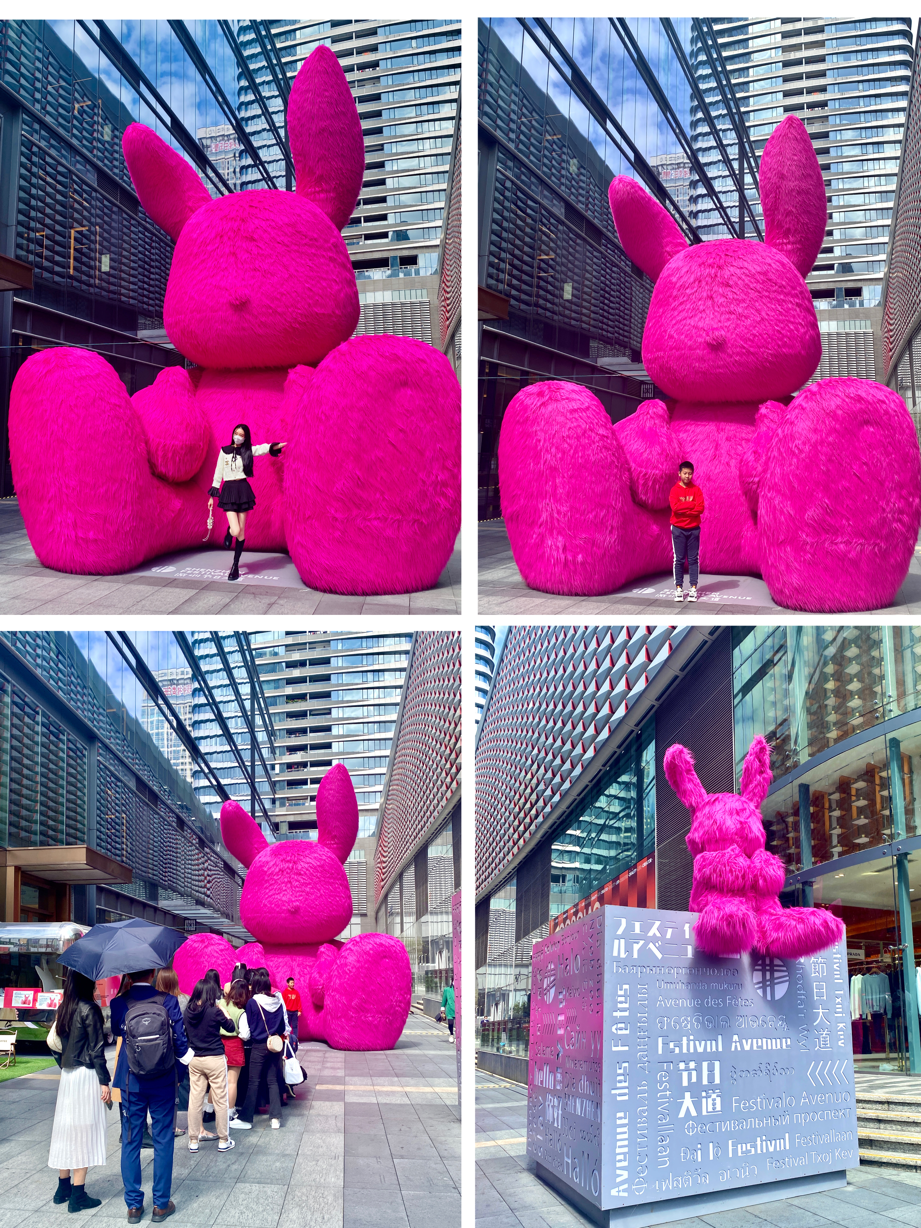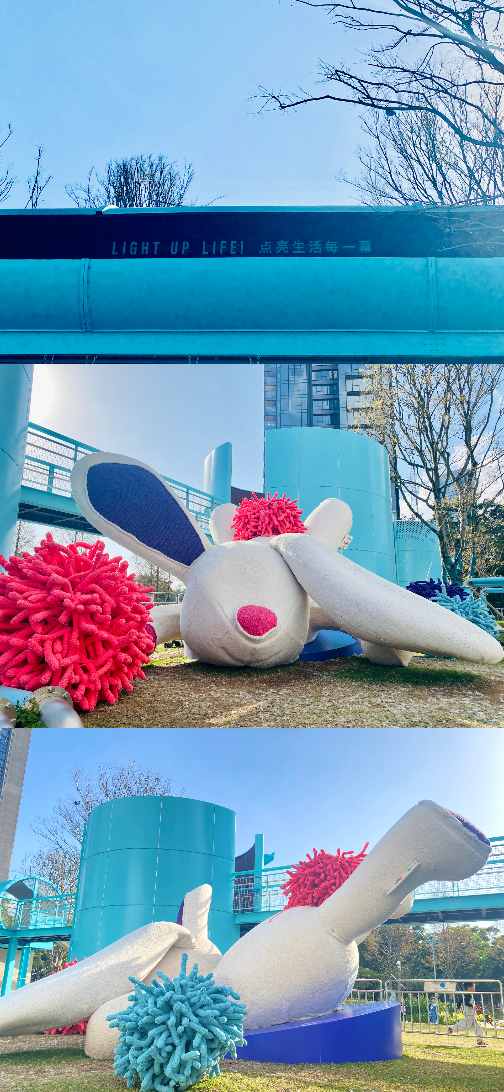 华侨城的三只“巨型萌兔”分别位于创意园南区大门、北区主干道街口及O·POWER文化艺术中心,是深圳文博会“遗留”下来的装置。色彩绚丽、憨态可掬的毛绒兔子,以充满亲和力的艺术手法具像化人际情感连接的力量,也成为新春里人们喜爱的“吉祥兔”。