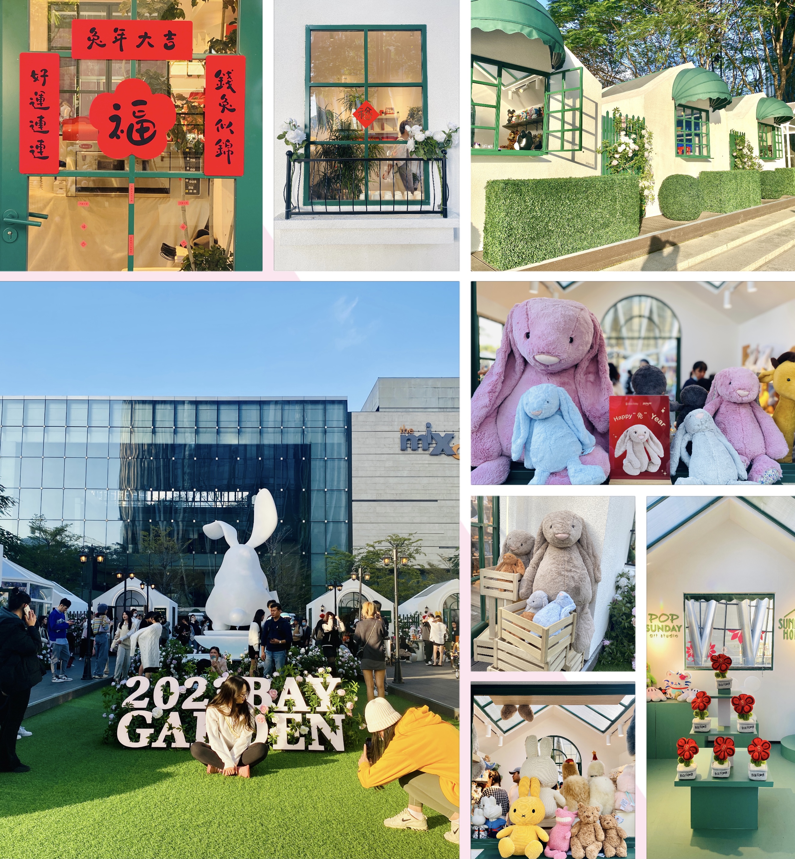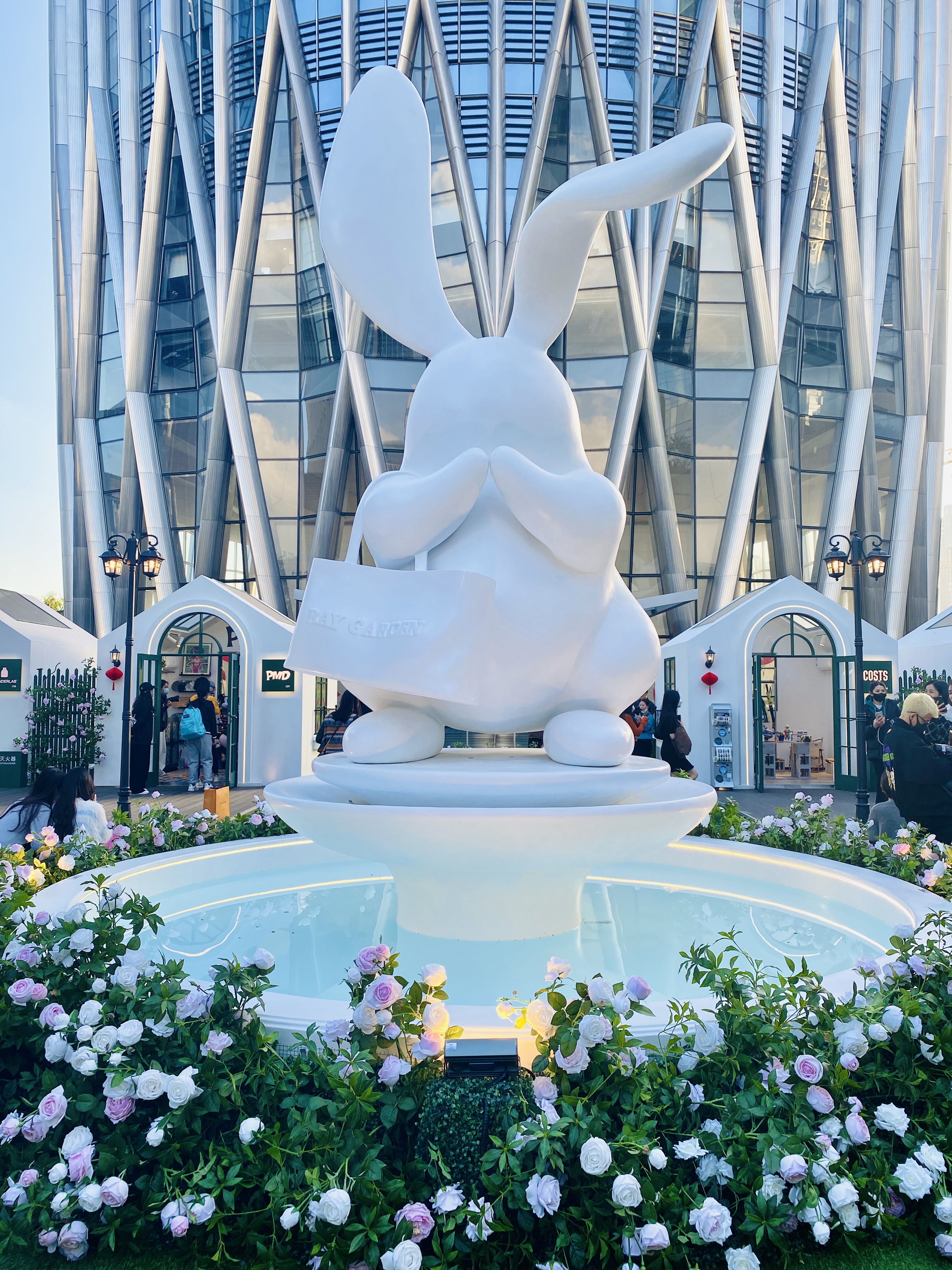 在深圳湾万象城的这只萌兔,带来的是一个梦幻集市。市集名为“Bay Garden 2023”,门口矗立着四米高巨型兔子喷泉尤为引人注意,市集里处处点缀着迷人玫瑰,就像带着人们进入爱丽丝的仙境。花园里、步道旁,处处是惬意休憩、舒适打卡的地方。