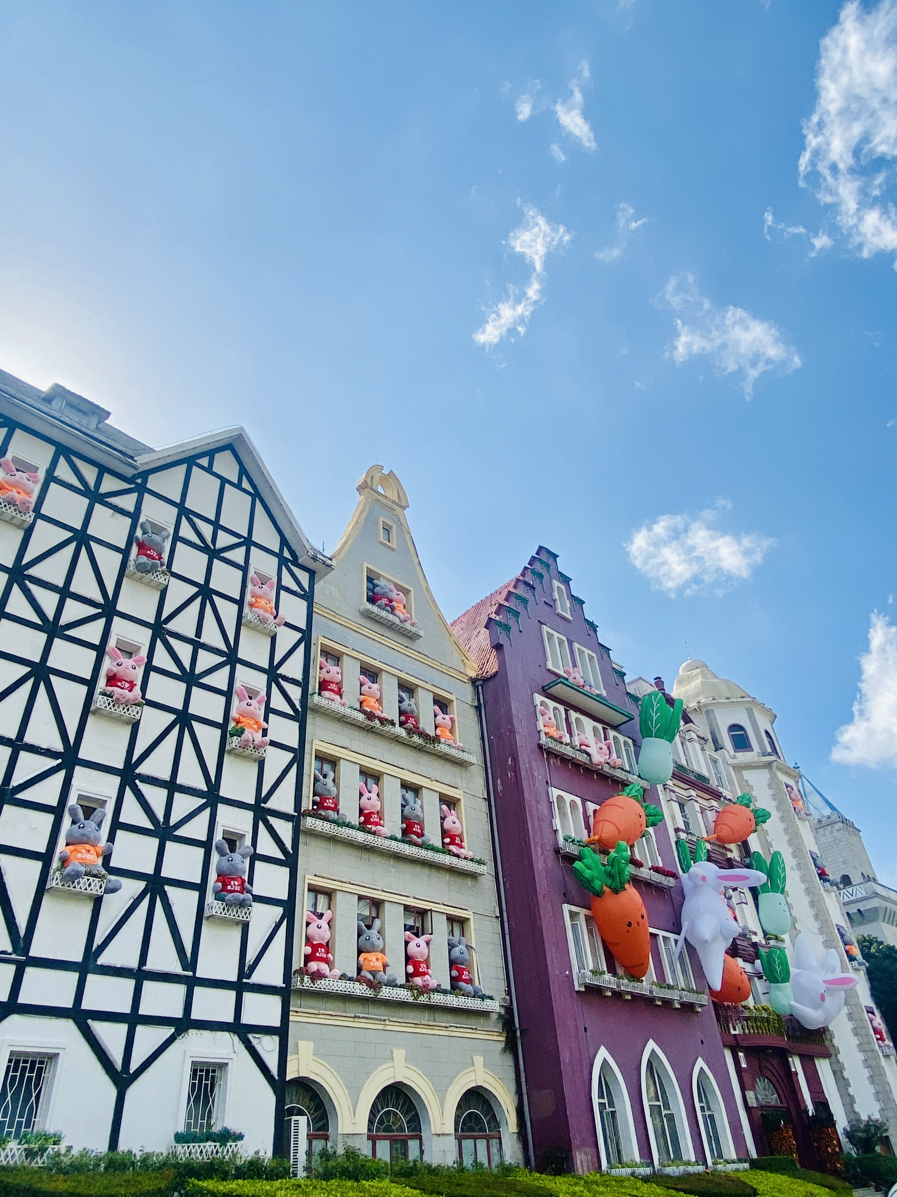 世界之窗狂欢节广场的萌兔,不仅大,还会“飞檐走壁”。在世界之窗狂欢节广场几幢城堡式建筑上,两只攀爬在墙壁的“巨型萌兔”正“追着”萝卜,贪吃的模样十分可爱。除了两只“巨型萌兔”,还有密密麻麻的兔子玩偶整齐的排列在各个窗台,让人恍若身处童话世界。