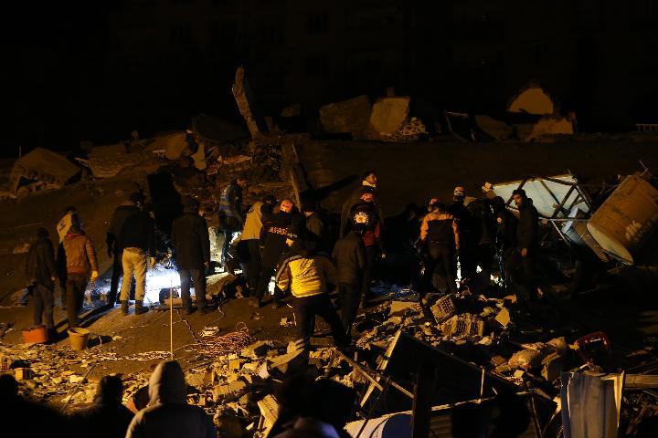 2月6日,救援人员在土耳其南部地震重灾区卡赫拉曼马拉什省帕扎尔哲克倒塌的建筑中搜寻幸存者。新华社发(穆斯塔法·卡亚 摄)