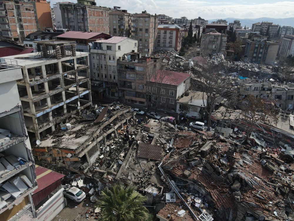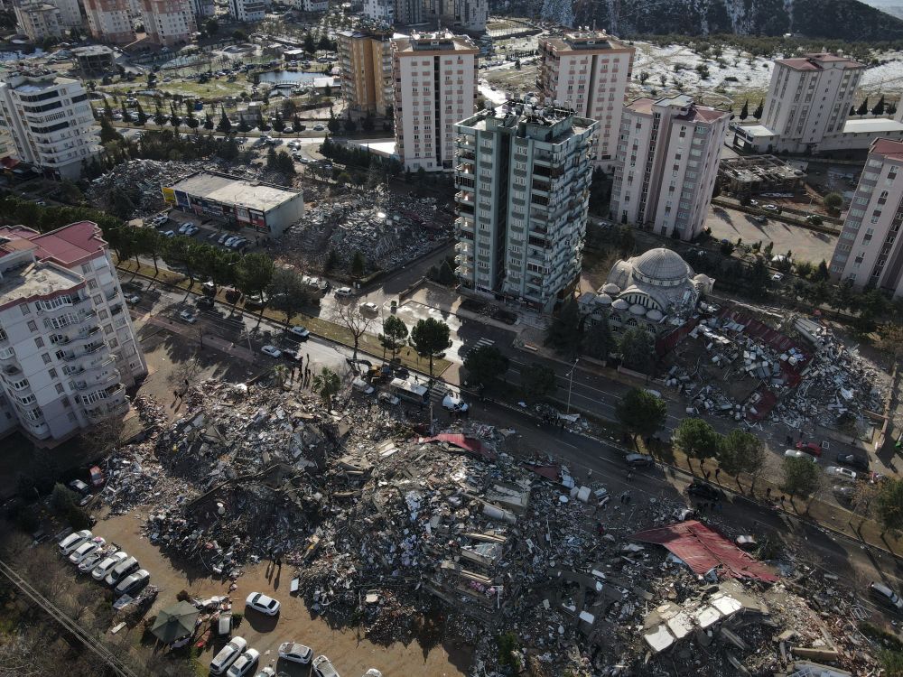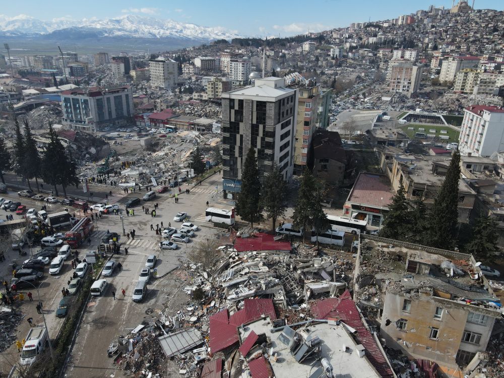 这是2月7日在土耳其南部卡赫拉曼马拉什市市中心拍摄的震后景象(无人机照片)。新华社发(穆斯塔法·卡亚摄)
