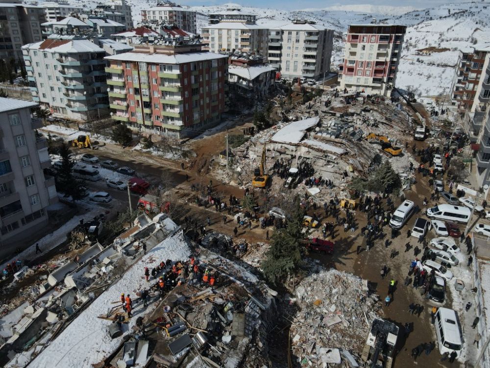 2月8日,在土耳其阿德亚曼省贝斯尼,救援人员在地震废墟搜救(无人机照片)。新华社发(穆斯塔法·卡亚摄)