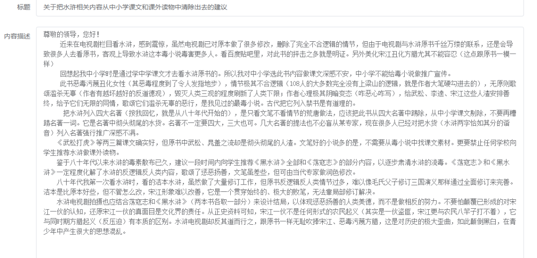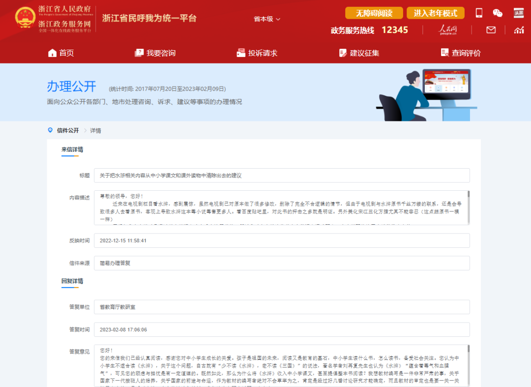 2022年12月,浙江省政府网站“浙江省民呼我为统一平台”上有人发布一篇留言《关于把水浒相关内容从中小学课文和课外读物中清除出去的建议》,认为《水浒》相关内容毒害青少年,应该从中小学课文和课外读物中清除出去。