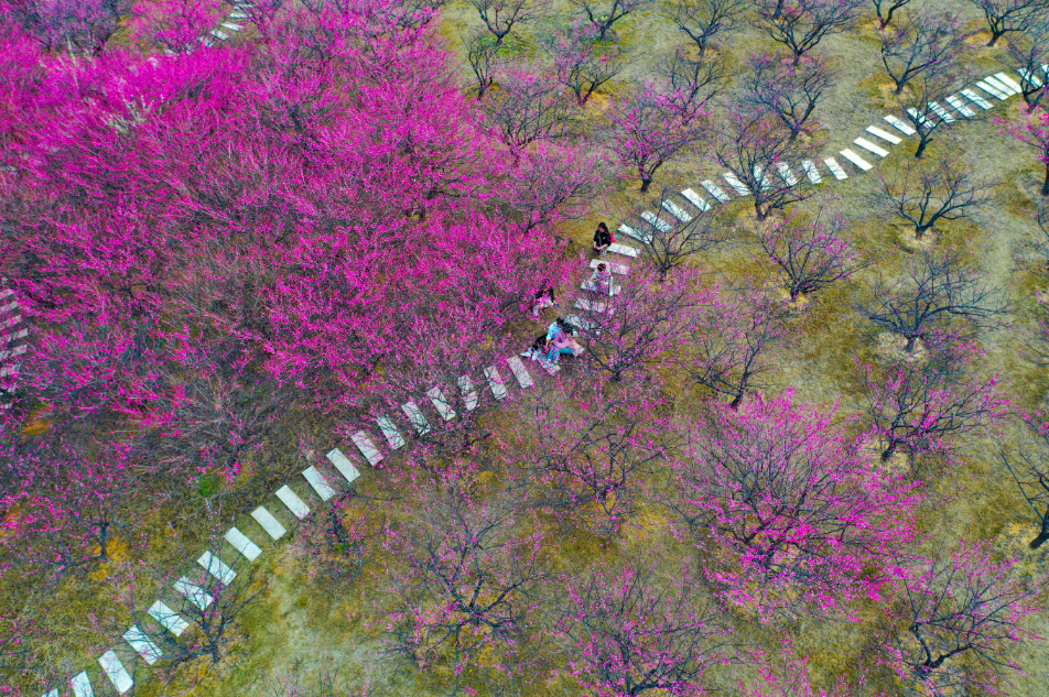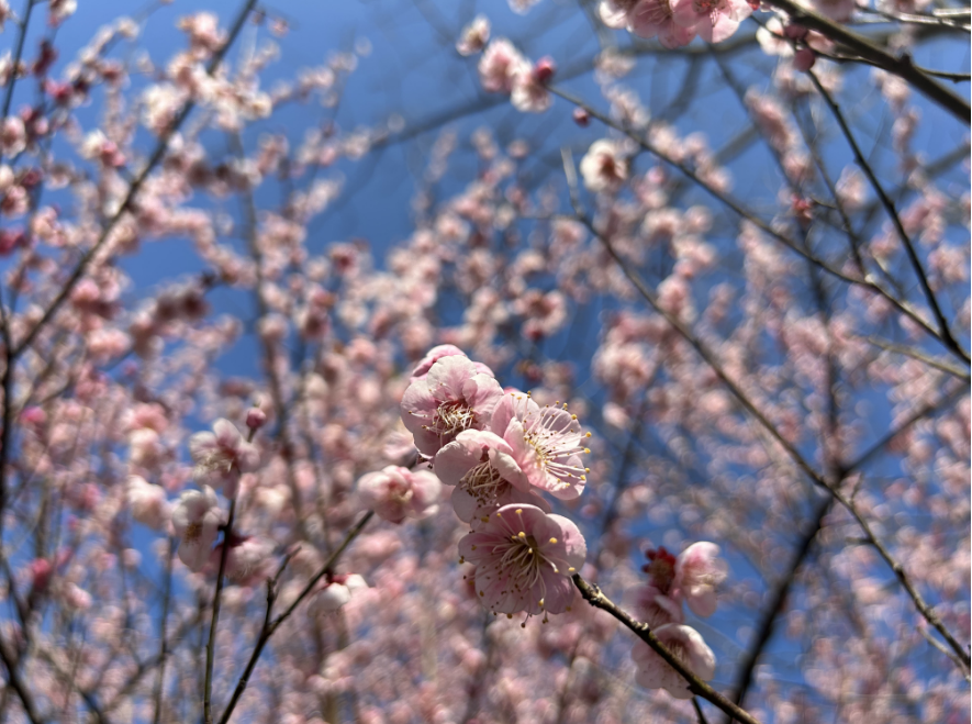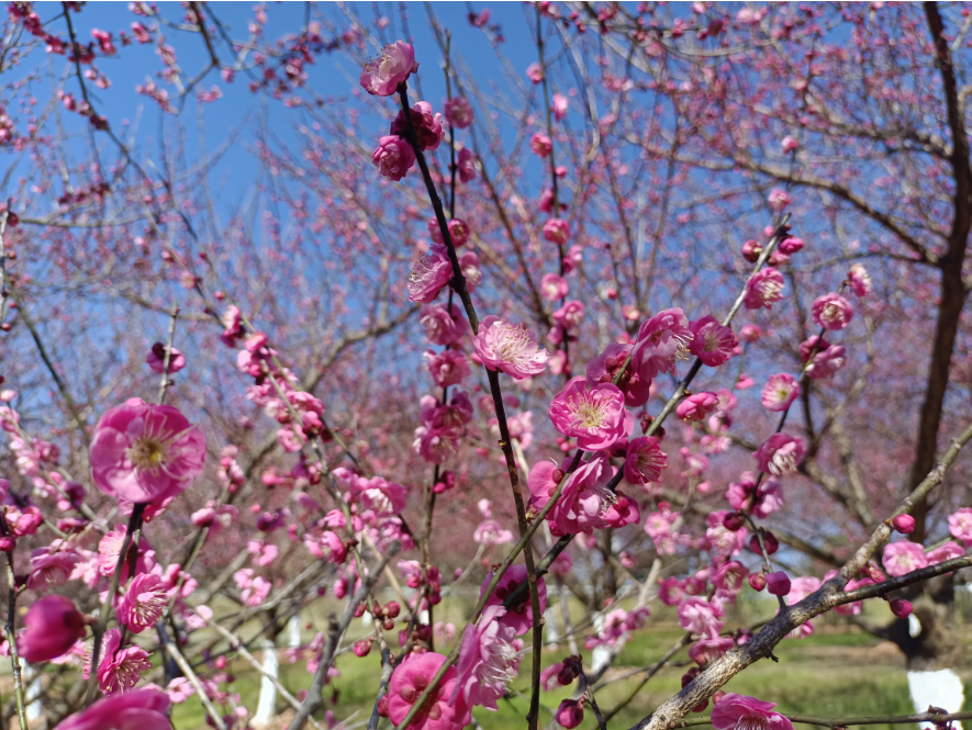 赛石城·花乐园的红梅正绚丽绽放,疏影横斜,暗香浮动。一树树一朵朵梅花傲立枝头,在蓝天白云的映衬下格外清新靓丽,走近树旁缕缕清香若有若无地浮散在风中,沁人心脾,书写着独属于初春的沁人馨香。