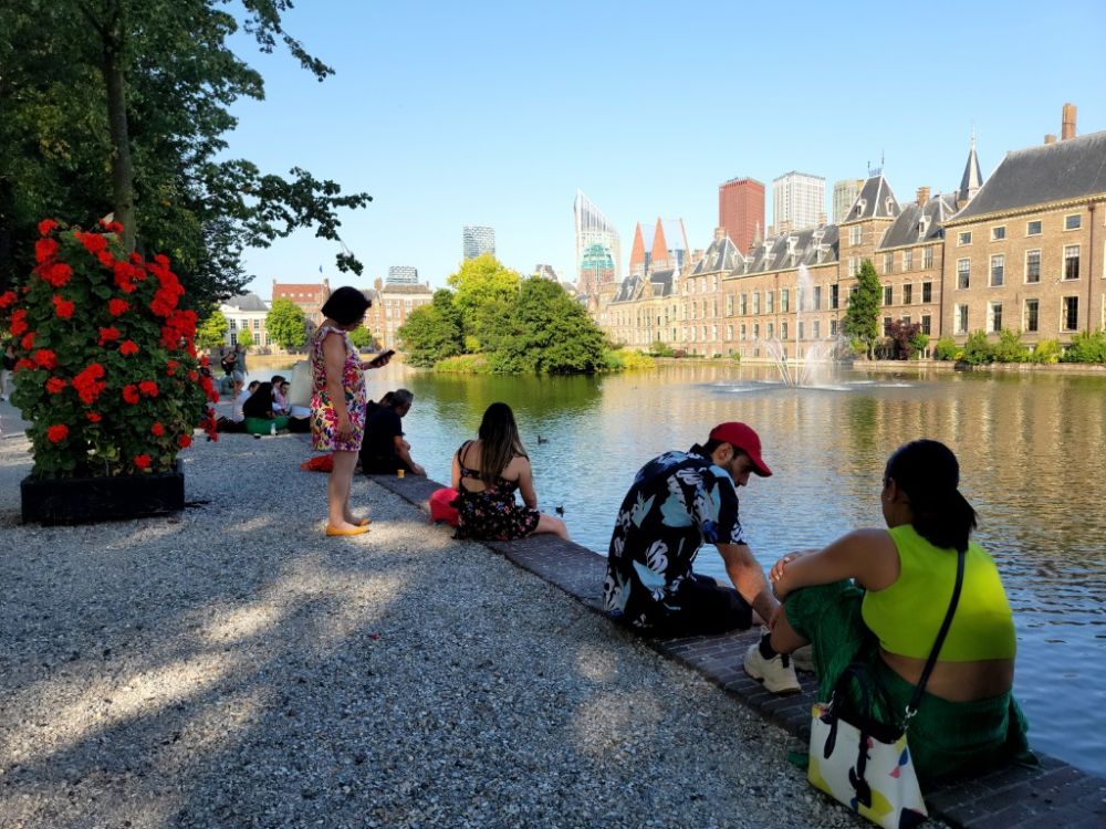 2022年7月19日,在荷兰海牙,人们在议会大厦附近的树荫下消暑纳凉。新华社记者王湘江摄