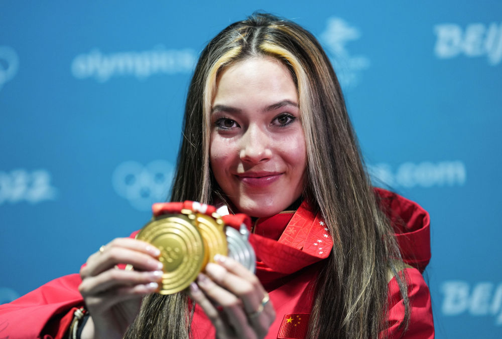 谷爱凌在北京冬奥会上展示获得的奖牌。新华社记者 薛玉斌 摄
