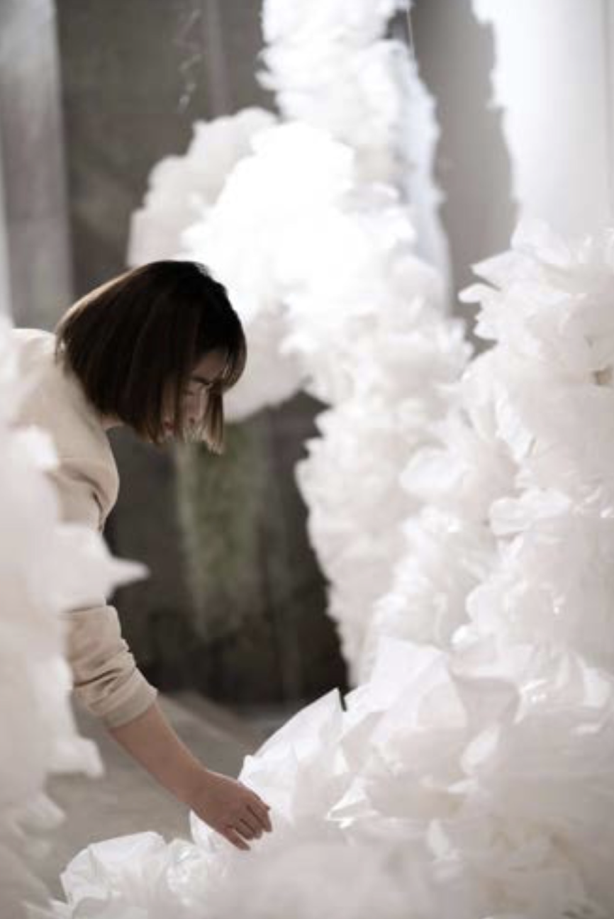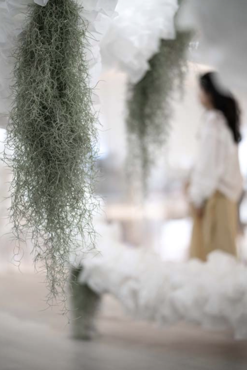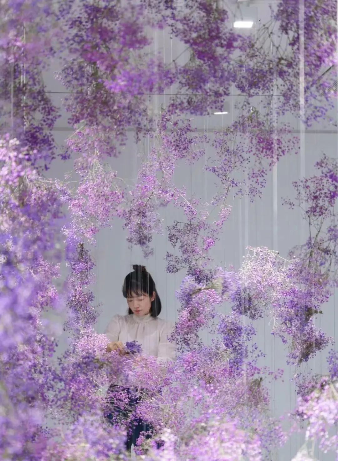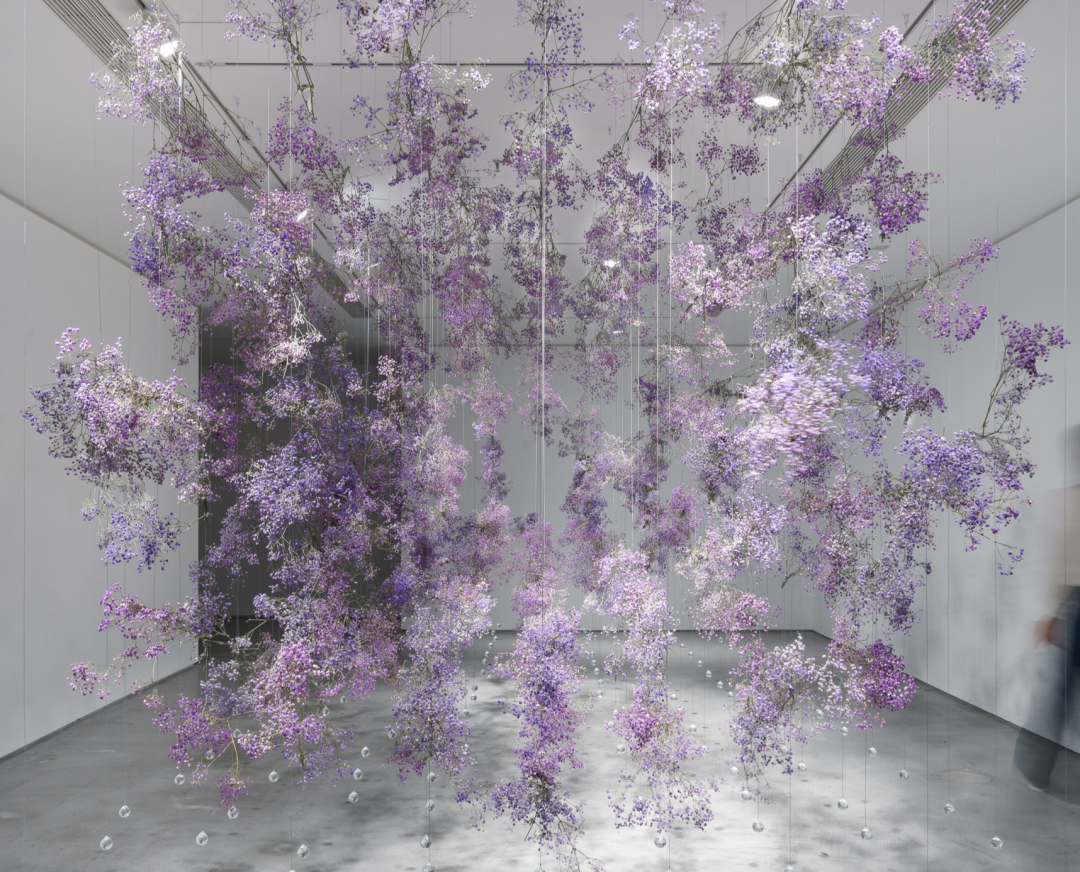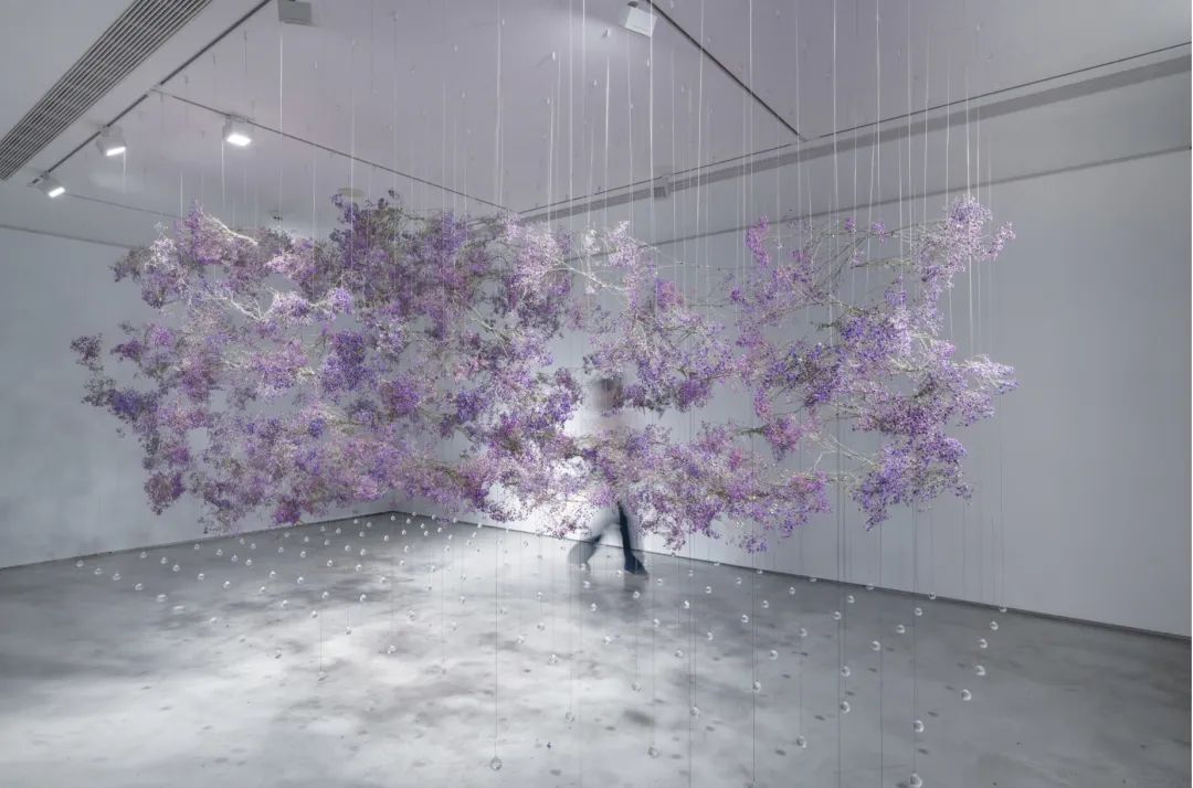 花艺术家金顺爱与花植相处了十多年时光,去年她在摩天轮画廊展出花艺装置《无垠II》,用紫色满天星搭建回旋通道,创造出一条浮在空中的浪漫花廊,如梦如幻,她说,“这幅作品是献给我老师的。”