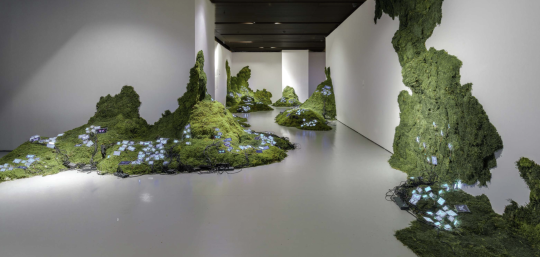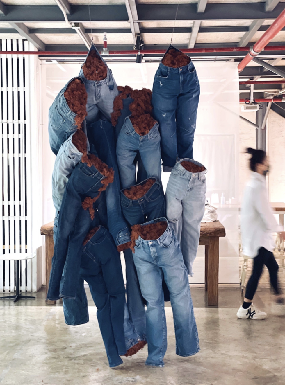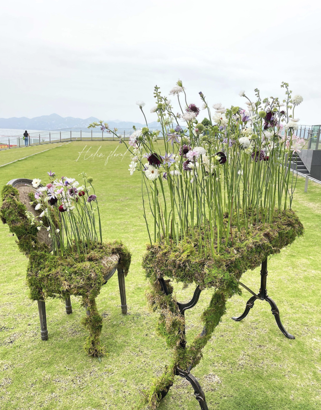 花植装置不仅局限于植物性材料,也会运用其他材料来加以辅助。在《爱丽丝梦游仙境》这件架构花艺装置中,金顺爱以椅子为框架,打造了一处立在椅子上的小花园。她在2022年发起的一项以环保为主题的艺术项目《Project J》,通过回收废旧牛仔并将其与永生苔藓结合,尝试为这种批量生产的快时尚代表物赋予新的意义,引人深思。