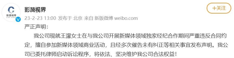 北京影漪视界科技有限公司官方微博@影漪视界发表声明称,公司系王濛在新媒体领域的独家经纪公司,“我公司现就王濛女士在与我公司开展新媒体领域独家经纪合作期间严重违反合同约定,擅自参加新媒体领域商业活动,且经多次催告未有纠正等相关事宜发布声明。我公司已委托律师启动诉讼程序,将依法、坚决维护我公司合法权益”。