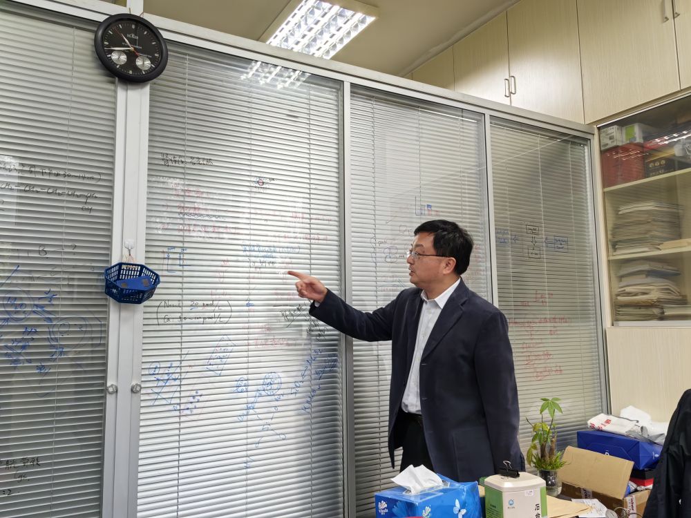 华东理工大学分析测试中心3楼,蓝闽波的办公室略显杂乱:一个资料柜门前挂着长尾夹,夹着厚厚一叠座谈、调研安排;书桌一旁的透明推拉门则被他当成了“白板”,上面用马克笔写满了各种化学分子式和思考要点。