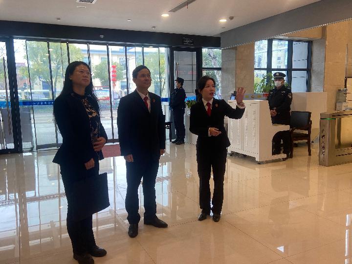 陈玮(左一)在衢州市中级人民法院走访调研。(新华社记者 黄筱 摄)