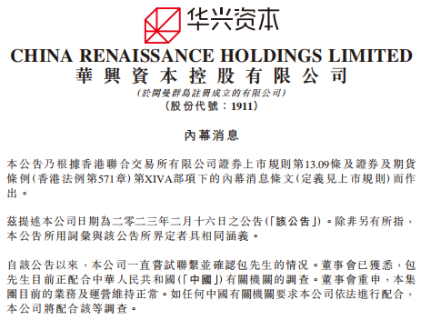 2月16日晚,华兴资本控股在港交所公告称,集团的董事会得悉公司暂时无法与包凡(公司董事会主席、执行董事、首席执行官和控股股东)取得联系。董事会并不知悉任何资料显示包凡失去联络一事与或可能与该集团的业务和或运作有关,而该集团目前业务及运作维持正常。