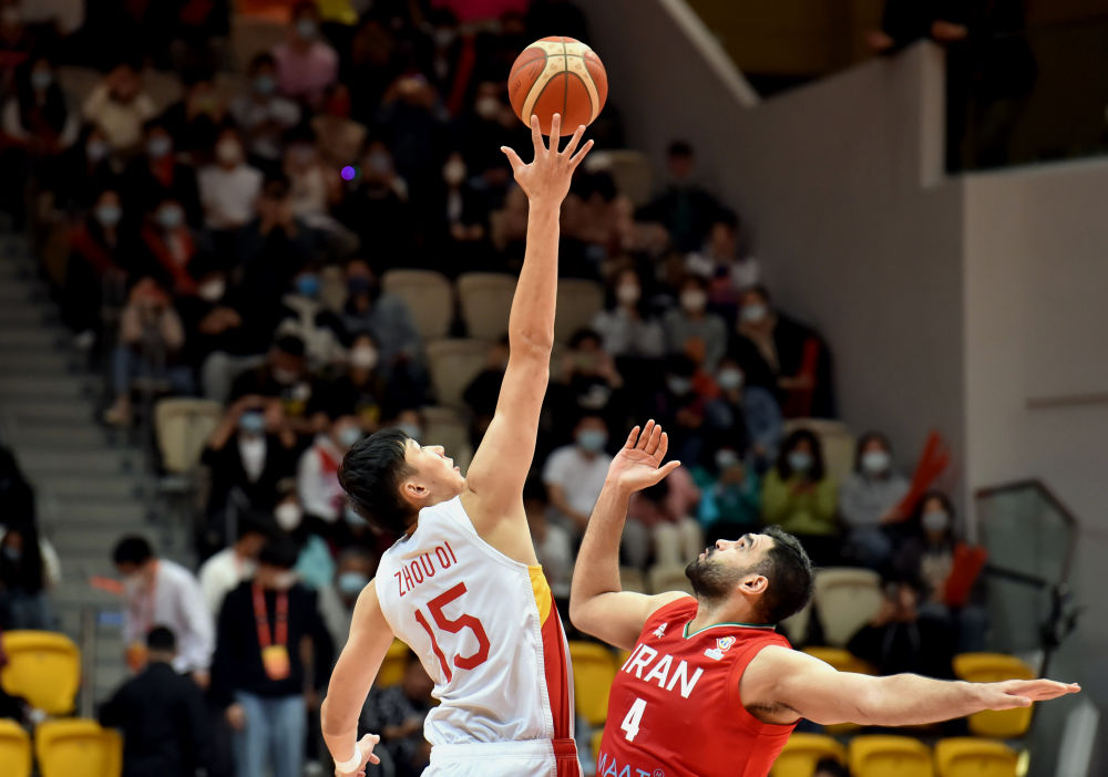 2月26日,中国队球员周琦(左)在比赛中跳球。当日,中国队以86:74战胜伊朗队。新华社记者 卢炳辉 摄