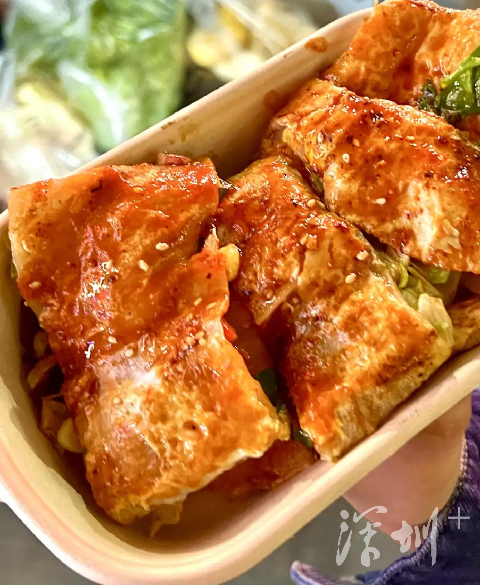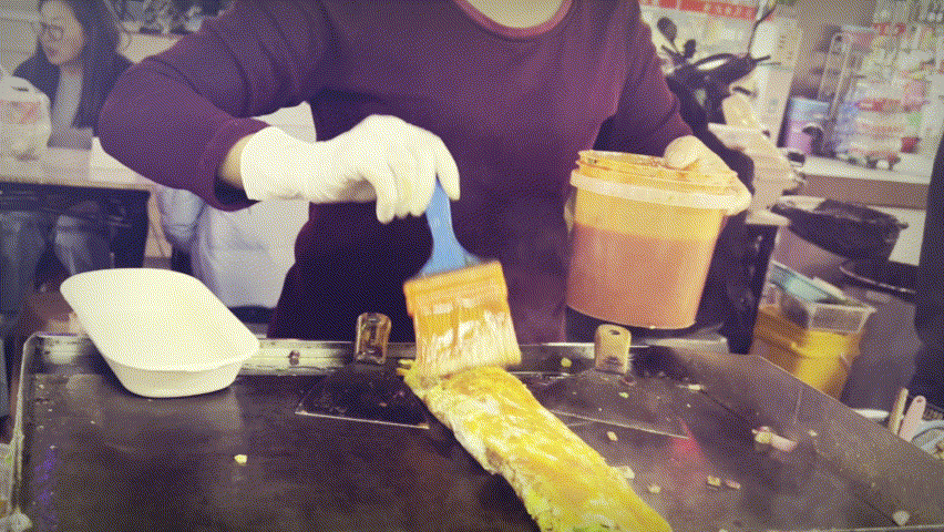 入街碰到的第一个排队的摊位就是烤冷面。摊主阿姨和一位年轻的女孩在顾摊。女孩负责点单、打包,阿姨负责制作,二人配合无间。刚制作好的烤冷面色泽金黄,酱汁浓郁,还冒着热气,当它们被递到食客面前时,大家几乎都毫不犹豫地选择在脚还没离开摊位前就炫上一大口。