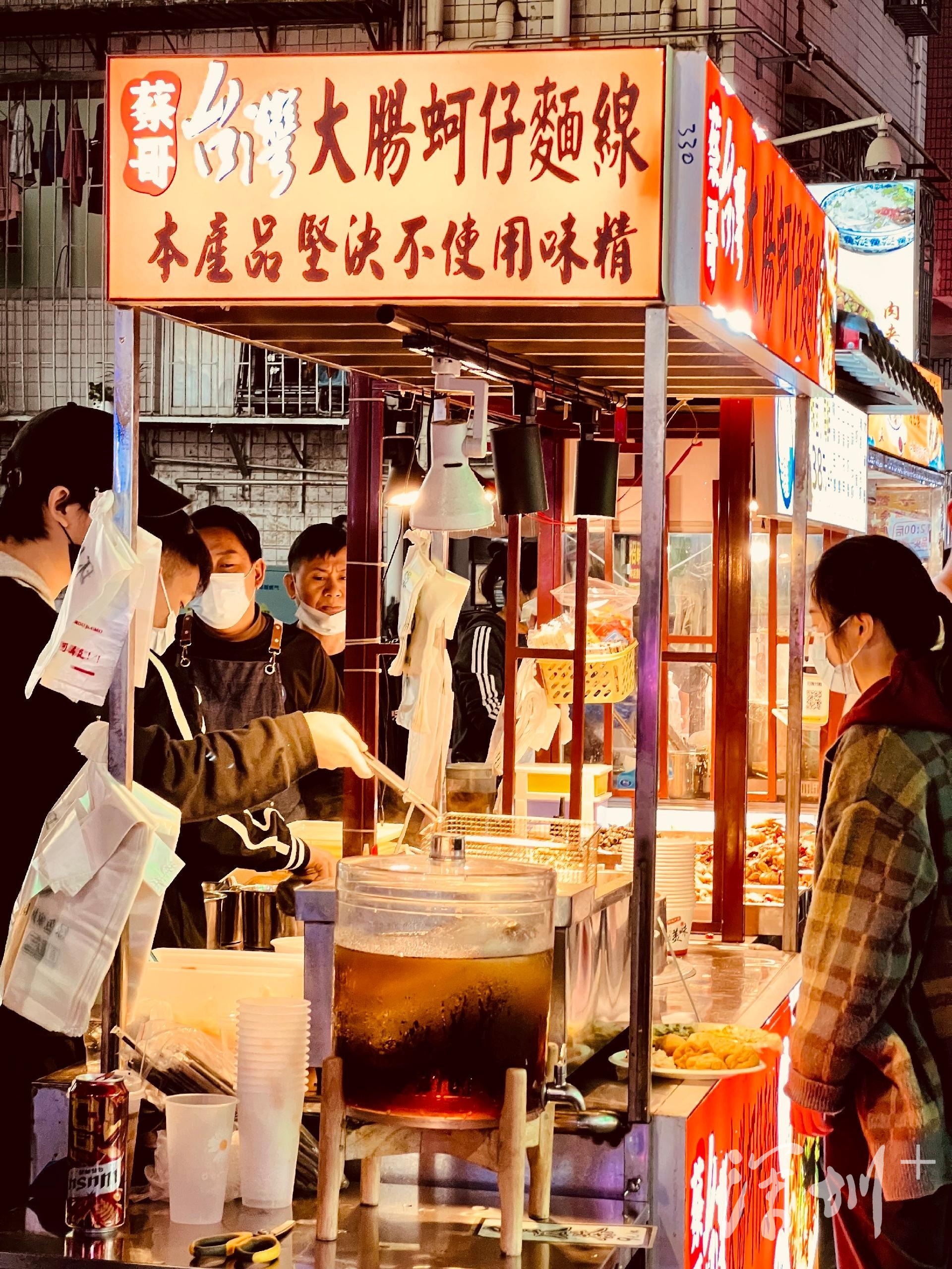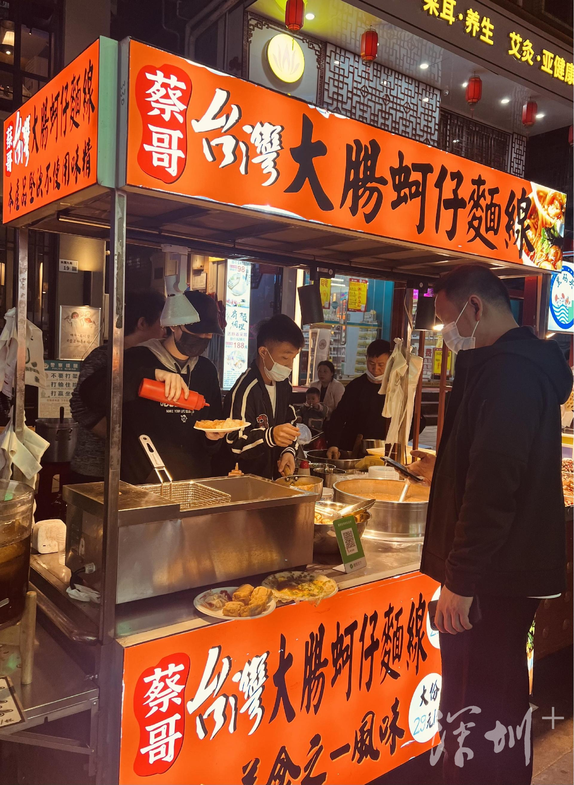 众多摊位中,一家售卖台湾小吃的店吸引很多人光顾。摊主蔡哥和合伙人都是台湾人,摊位上主售大肠蚵仔面线,兼卖冬瓜茶、台湾炸豆腐。大肠蚵仔面线和炸豆腐的锅一左一右置于摊位上,锅内的食物散发的香气是最好的广告。摊位右后方支了两张小桌,食客不论男女老少,买上一碗吃的,就围桌而坐,吃完后都默契地迅速离场,将座位留给下一位客人。