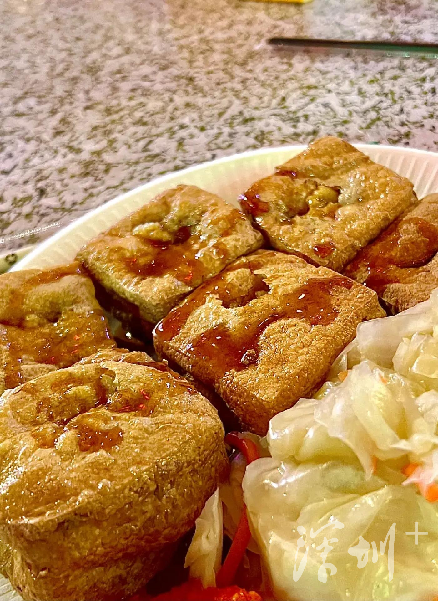大肠蚵仔面线内容丰富,除了名字里包含的三种食材,还加了青菜,吃上一口咸香四溢,口感爽滑,非常特别。炸豆腐的工艺看起来和长沙臭豆腐的差不多,但吃法却大不相同。炸得外脆里嫩的豆腐,淋上特制的酱汁,再配上辣椒酱和酸甜的泡白菜一起食用,豆腐的香和配料的酸、甜、辣结合,层次丰富回味无穷。