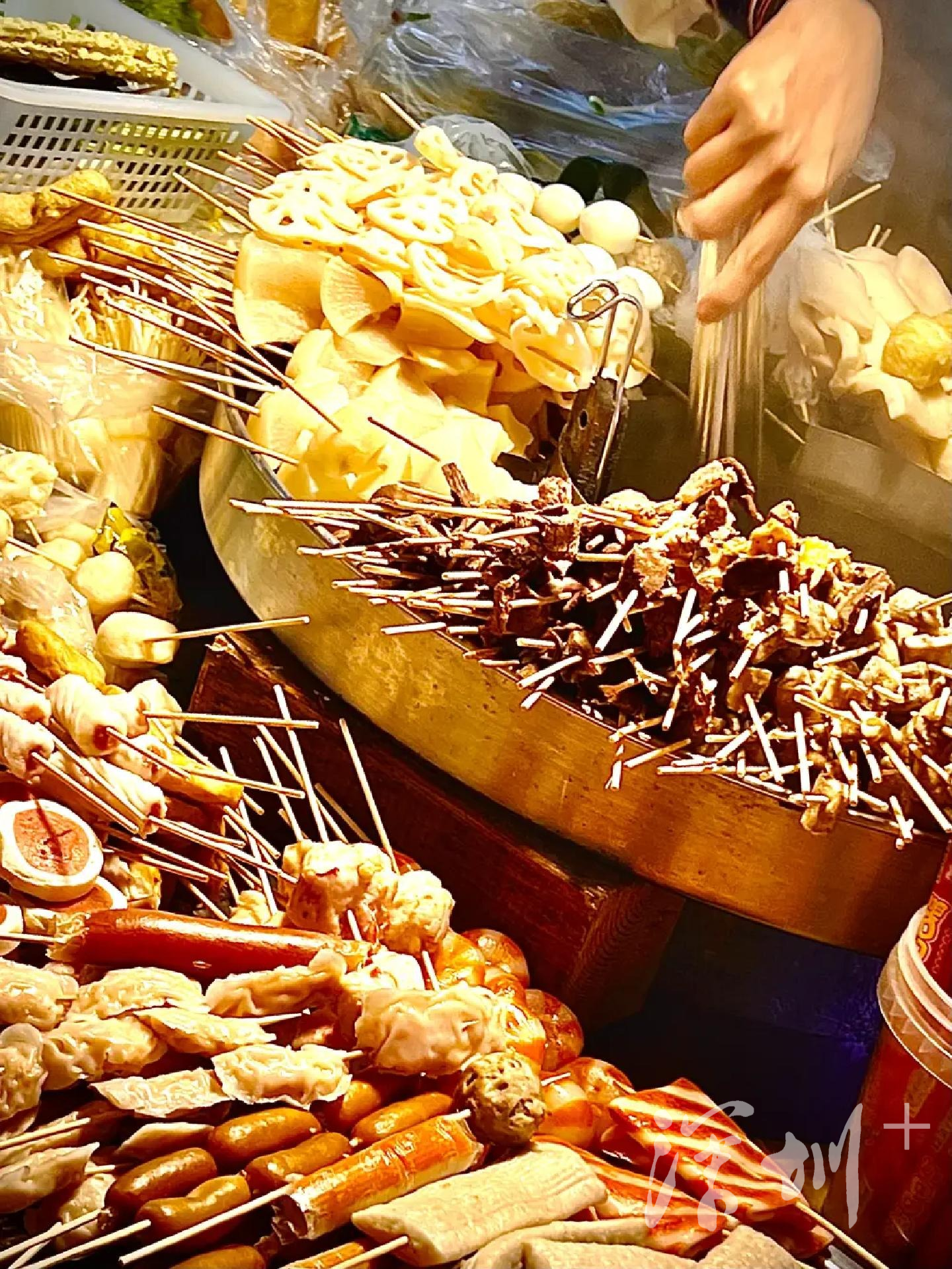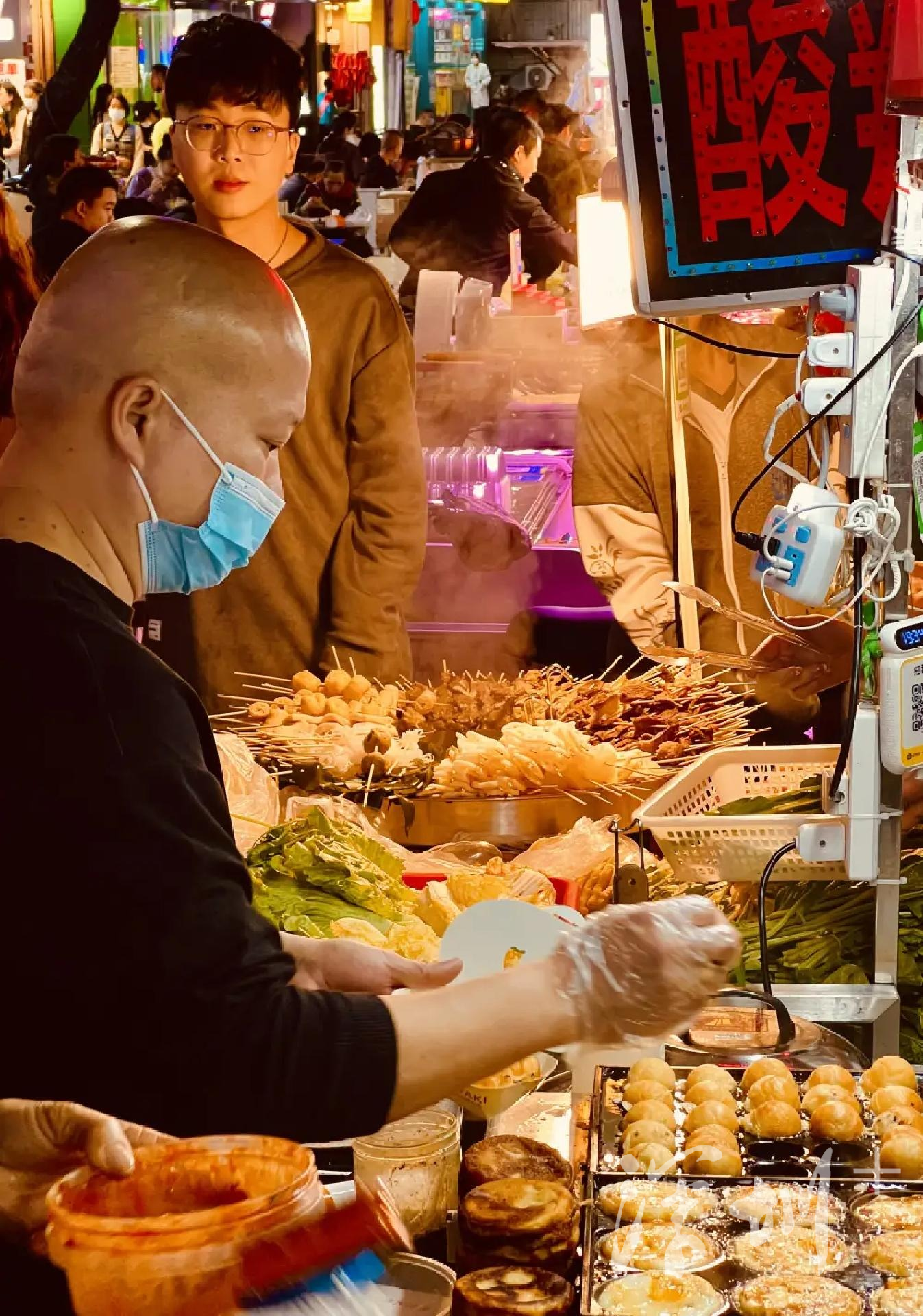 下午6点左右,水围夜市街进入忙碌的高峰前奏,鱼贯而入的人群涌向各个摊位,寻觅自己中意的美味。麻辣烫、烤冷面、烧烤、酸辣粉、卤煮、柠檬茶、甜品、寿司.....这条并不长的街道,却集各地美食之精华,仿佛一个小型地方美食展。