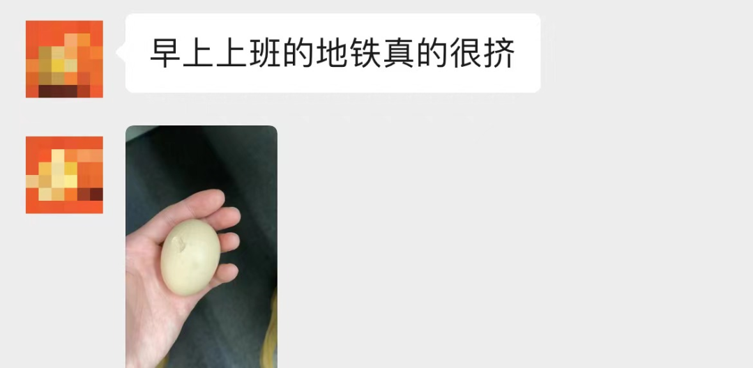 (网友投稿:地铁太挤,把水煮蛋鸡蛋壳挤裂开了。)