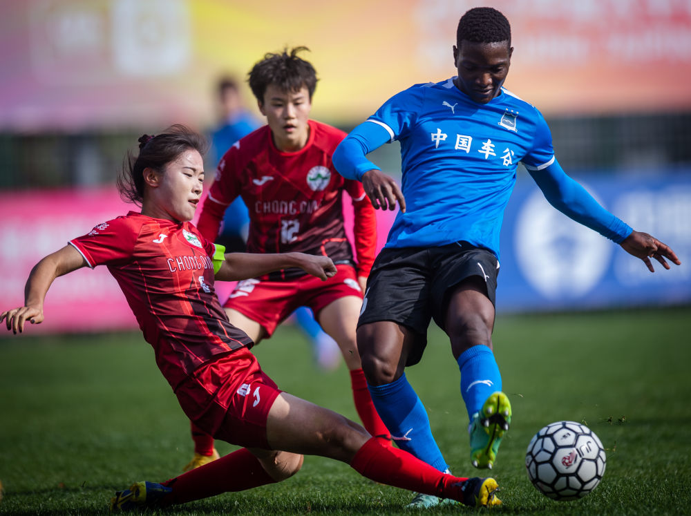 3月4日,北京女足队球员马晓兰(右)与河南中原女足队球员樊梦霏在比赛中拼抢。新华社记者 李嘉南 摄