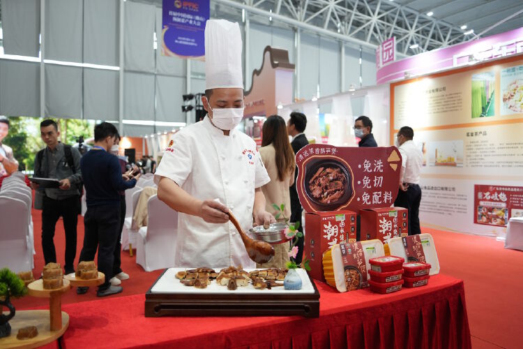 清远市技师学院粤菜师傅邓振锋、黄文鑫、罗秋汝等人更是带来了“清远好风土”品牌优质农产品食材预制菜——五指毛桃清远鸡、连州菜心桂鱼卷、清远丝苗米腊味炒饭、西牛笋衣黄糍、英德红茶桂花糯米糕,吸引现场客人争相品尝。