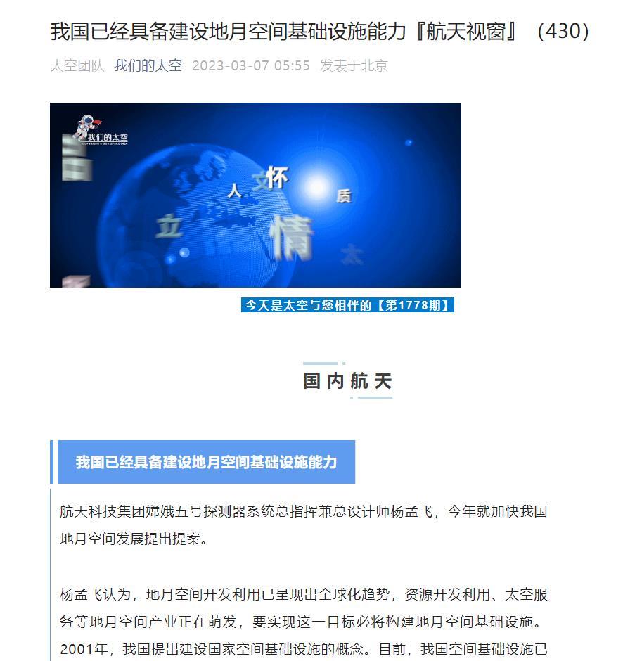 航天科技集团嫦娥五号探测器系统总指挥兼总设计师杨孟飞,今年就加快我国地月空间发展提出提案。