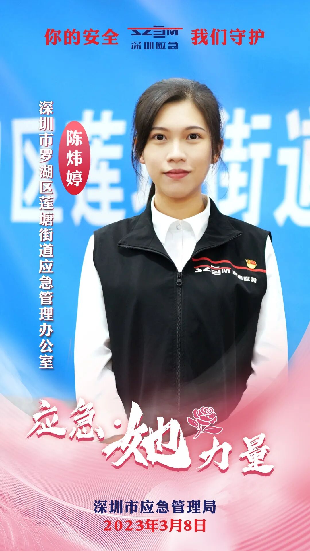 简要事迹:陈炜婷在2022年9月听闻组织急需防疫人员后,毅然前往抗击疫情一线,为深圳疫情“外防输入”守好口岸防控线,连续坚守防疫驿站30余个日夜,处理口岸工作人员闭环管理及应急相关工作。在疫情严峻时期,她又承担应急管理办内勤与外勤工作,出色完成了各项安全专项行动方案、工作总结撰写等综合工作。她还深入到工贸企业、“三小场所”、出租屋等,排查隐患800余处,为辖区发展夯实安全基础。从抗疫一线到应急一线,她的实际行动生动展现了一名应急新兵、应急娘子军甘于奉献、勇于担当的时代风采。
