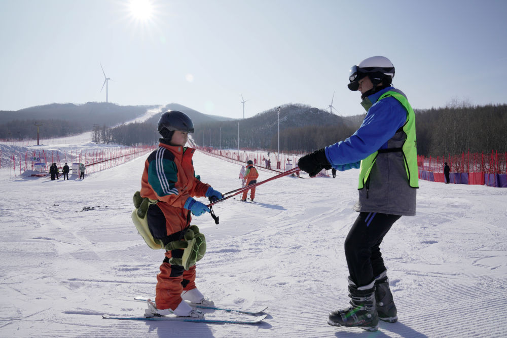 2023年2月8日,在松花江敖其湾滑雪场,小朋友在滑雪教练的指导下滑雪。新华社记者 王建威 摄