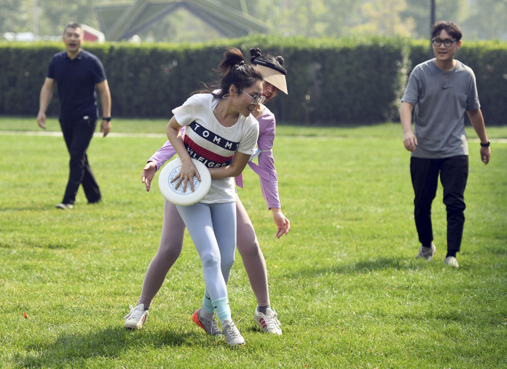 2022年9月29日,北京市企业员工温斐芾(前)在飞盘比赛中拼抢。新华社记者 任超 摄