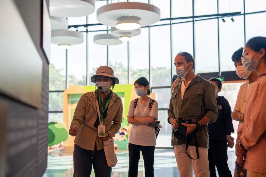 Convertino (in olive-green shirt) visits the nature education exhibition hall at Futian Mangrove Ecological Park with his students. Lin Jianping 孔韦尔蒂诺(身着橄榄色衬衫)与学生们一起参观红树林生态公园科普展厅。林建平摄