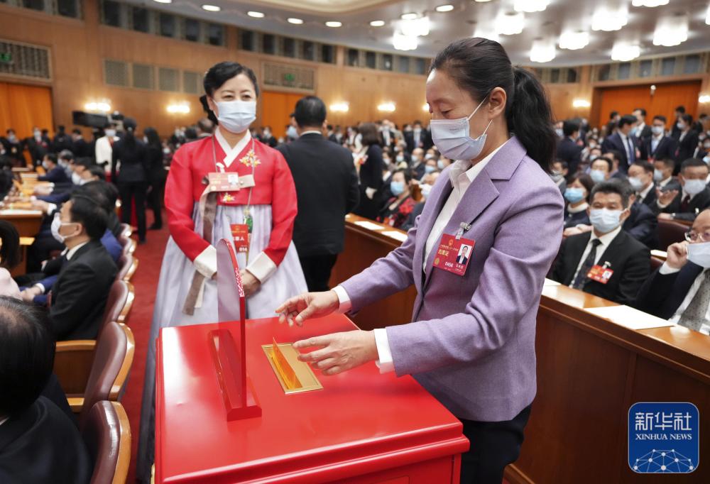 3月12日,十四届全国人大一次会议在北京人民大会堂举行第五次全体会议。这是代表在投票。新华社记者 王毓国 摄