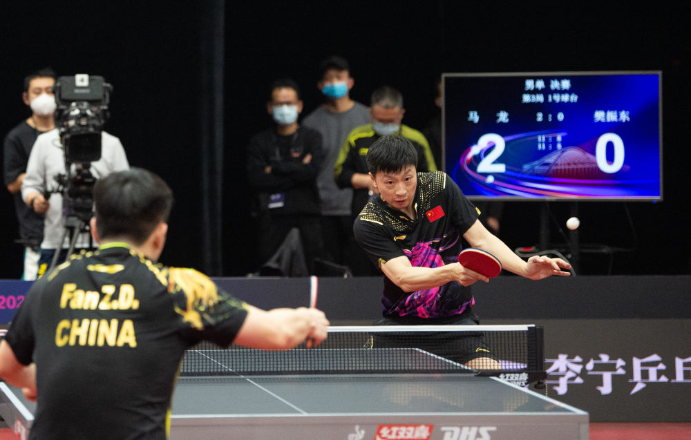 2月23日,中国乒乓球队德班世乒赛选拔赛男单决赛中,马龙(右)战胜樊振东夺冠。新华社记者 陈钟昊 摄