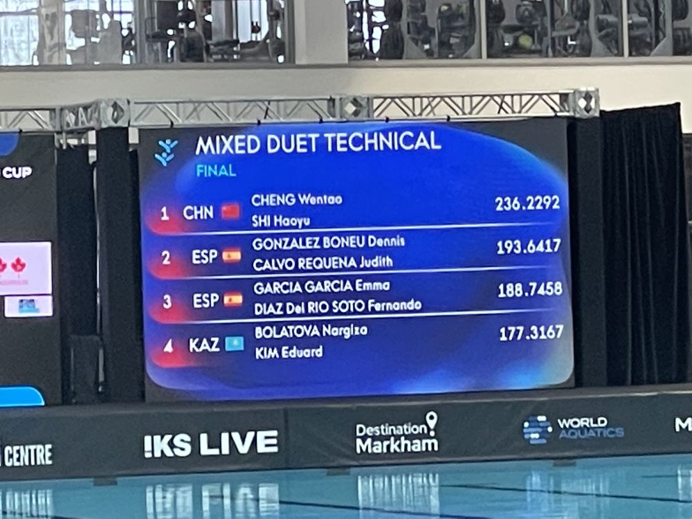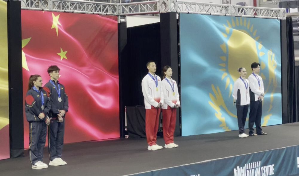 混双技术自选比赛共有7对选手参加,石浩玙和程文涛以“势不可挡”的力量与激情获得236.2292分,领先来自西班牙的亚军组合40多分。