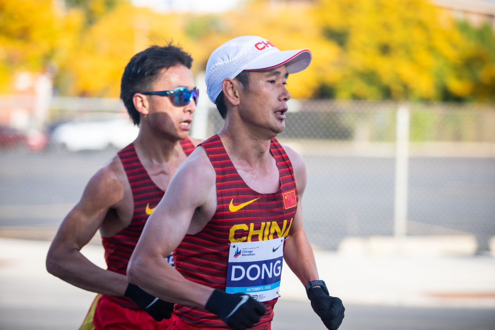 ↑资料图:2022年10月9日,中国选手董国建(右)在芝加哥马拉松赛中跑出2小时8分53秒,达到布达佩斯世锦赛参赛标准。新华社发(文森特·约翰逊摄)