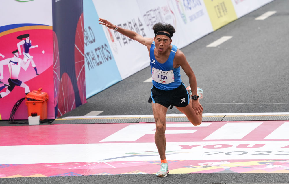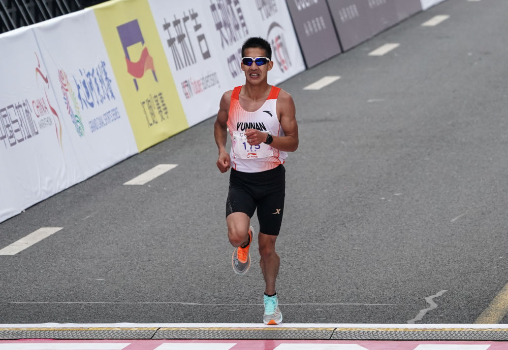 ↑3月19日,杨绍辉在比赛中冲过终点线。新华社记者 杨磊 摄