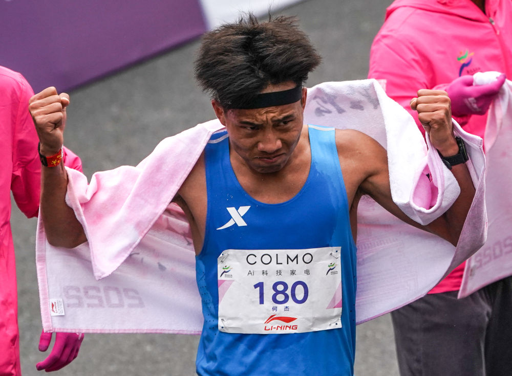 ↑3月19日,何杰在比赛中冲过终点线。新华社记者 杨磊 摄