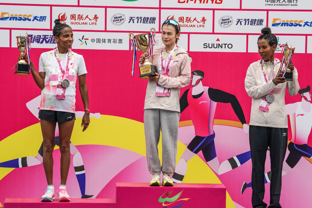 ↑3月19日,中国选手白丽(中)在领奖台上。新华社记者 杨磊 摄