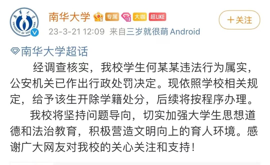 @南华大学 3月21日发微博称,经调查核实,我校学生何某某违法行为属实,公安机关已作出行政处罚决定。现依照学校相关规定,给予该生开除学籍处分,后续将按程序办理。