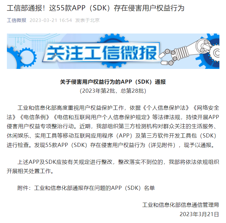 (原标题《工信部通报!这55款APP(SDK)存在侵害用户权益行为》)