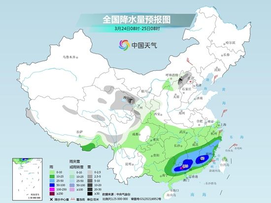 今明两天(3月24日至25日),在冷空气和暖湿气流的对峙下,江南、华南强降雨持续,其中,江南南部、华南中东部部分地区有暴雨,局地大暴雨,并伴有短时强降水、雷暴大风、冰雹等强对流天气。气温方面,今天,中东部一带仍会继续降温,长江中下游最高气温跌至10℃左右,提醒公众注意及时添衣保暖,避免感冒。