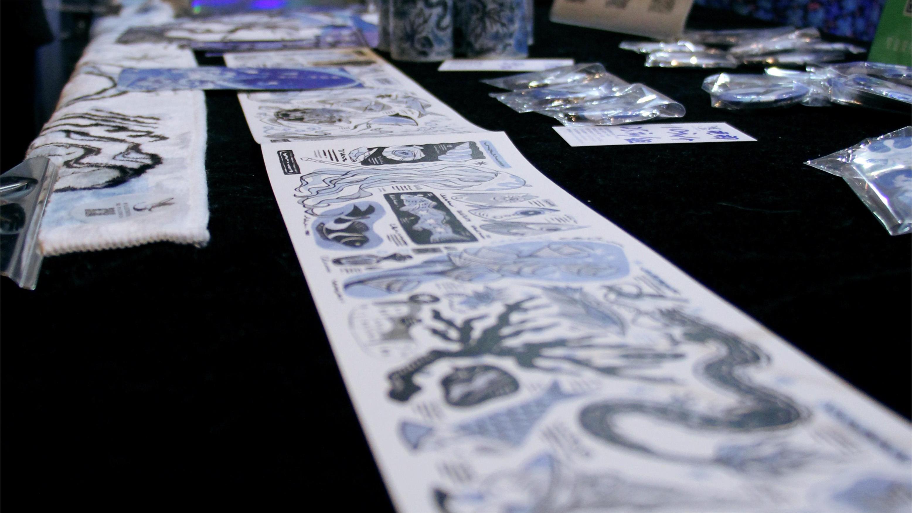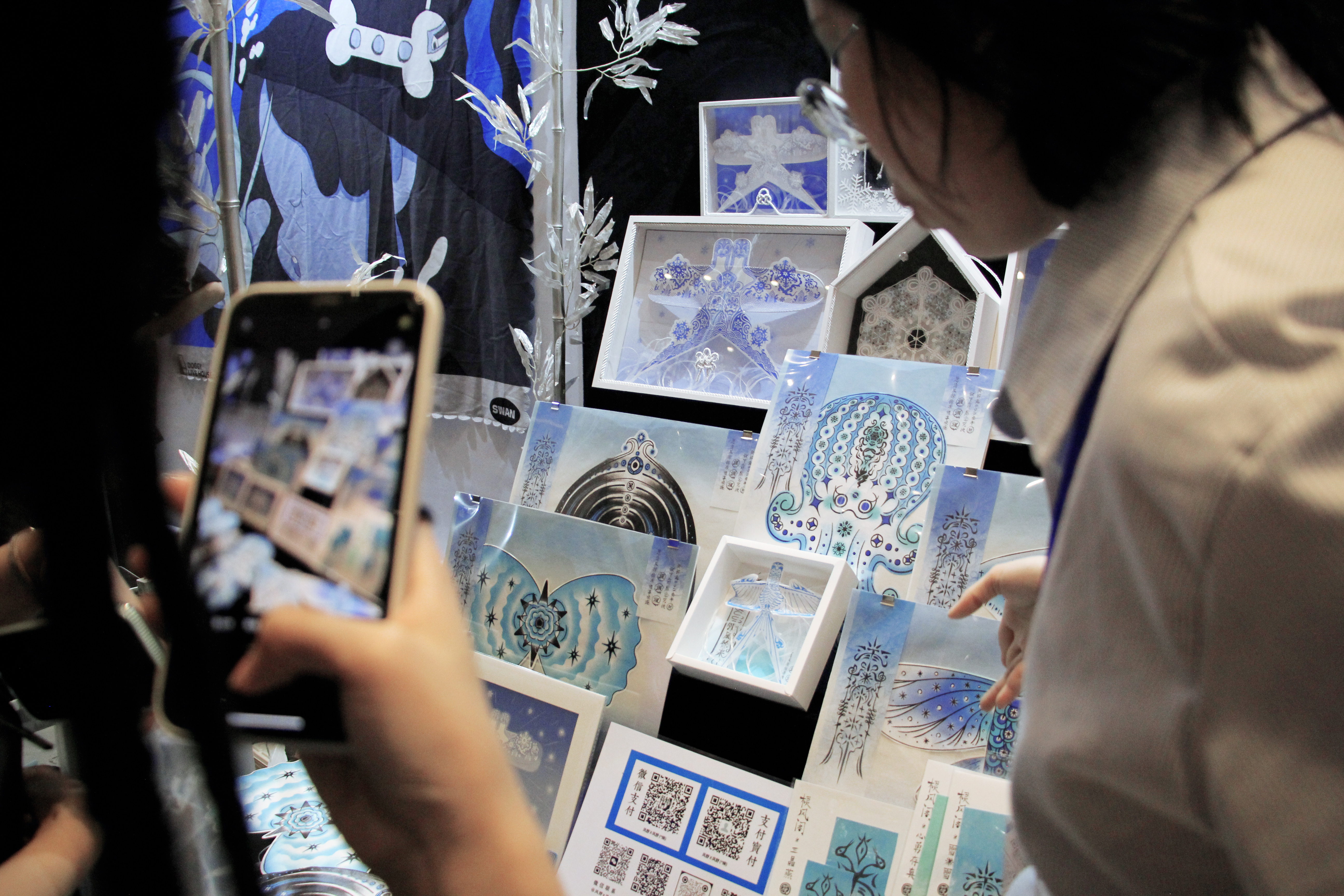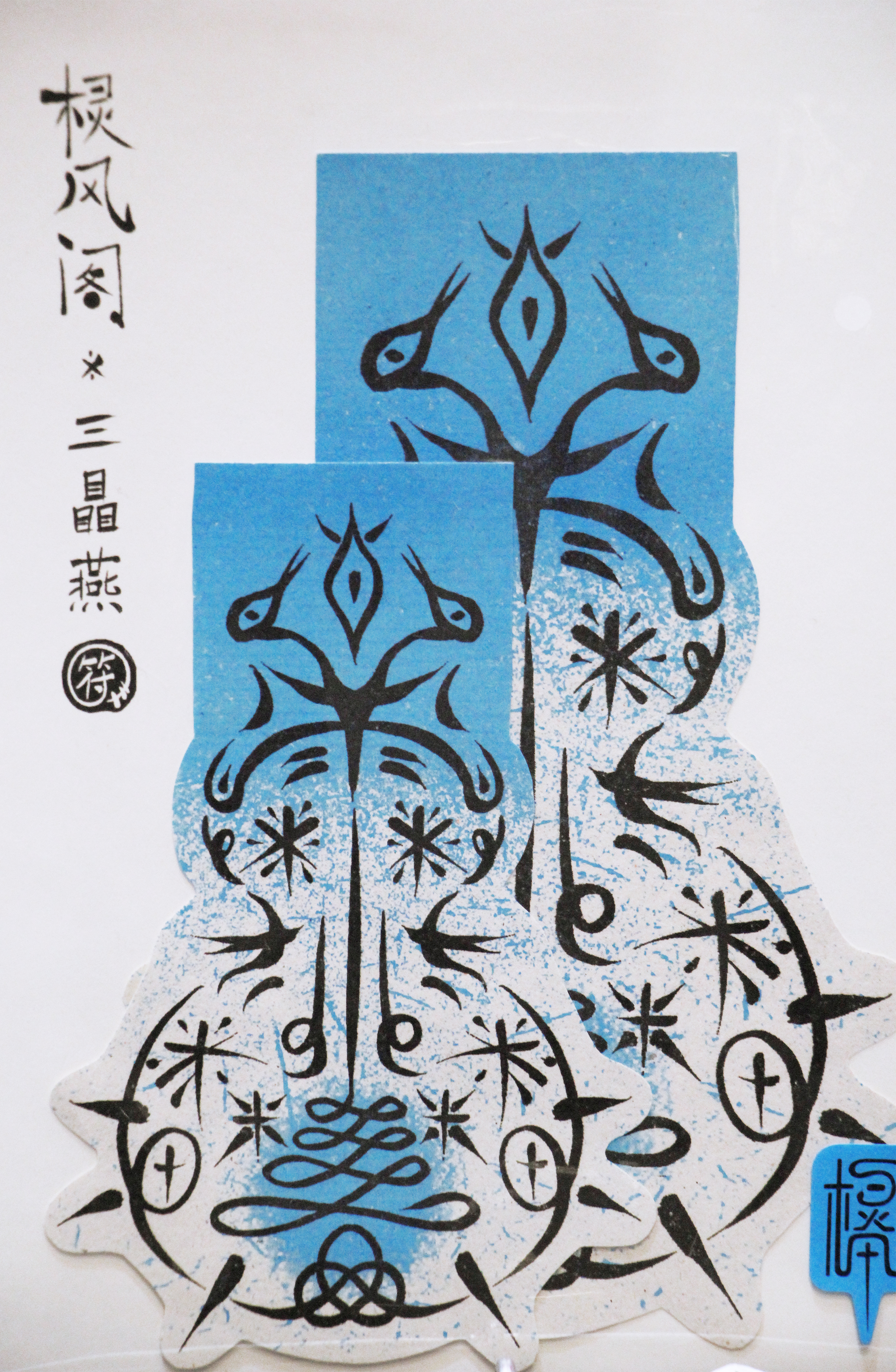 抑扬顿挫的笔法在极致对称的构图下,描绘出中国传统工笔画的韵味,底部配上喷洒、蘸染的水蓝色,一对装裱在画框里的“三晶燕”是摊位上最显眼的作品。