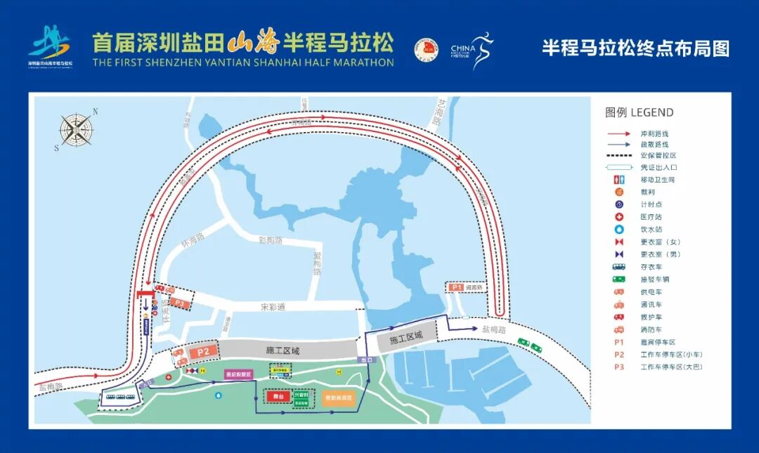 半程马拉松赛道总长21.0975公里,起点位于盐田区行政文化中心广场,沿途经过灯塔图书馆、海滨栈道、盐田港、海鲜街、盐梅路等特色地标,终点位于“鹏城十景”之一的大梅沙海滨公园,全面展现盐田“山高、水清、岸绿、景美”的秀丽风光。