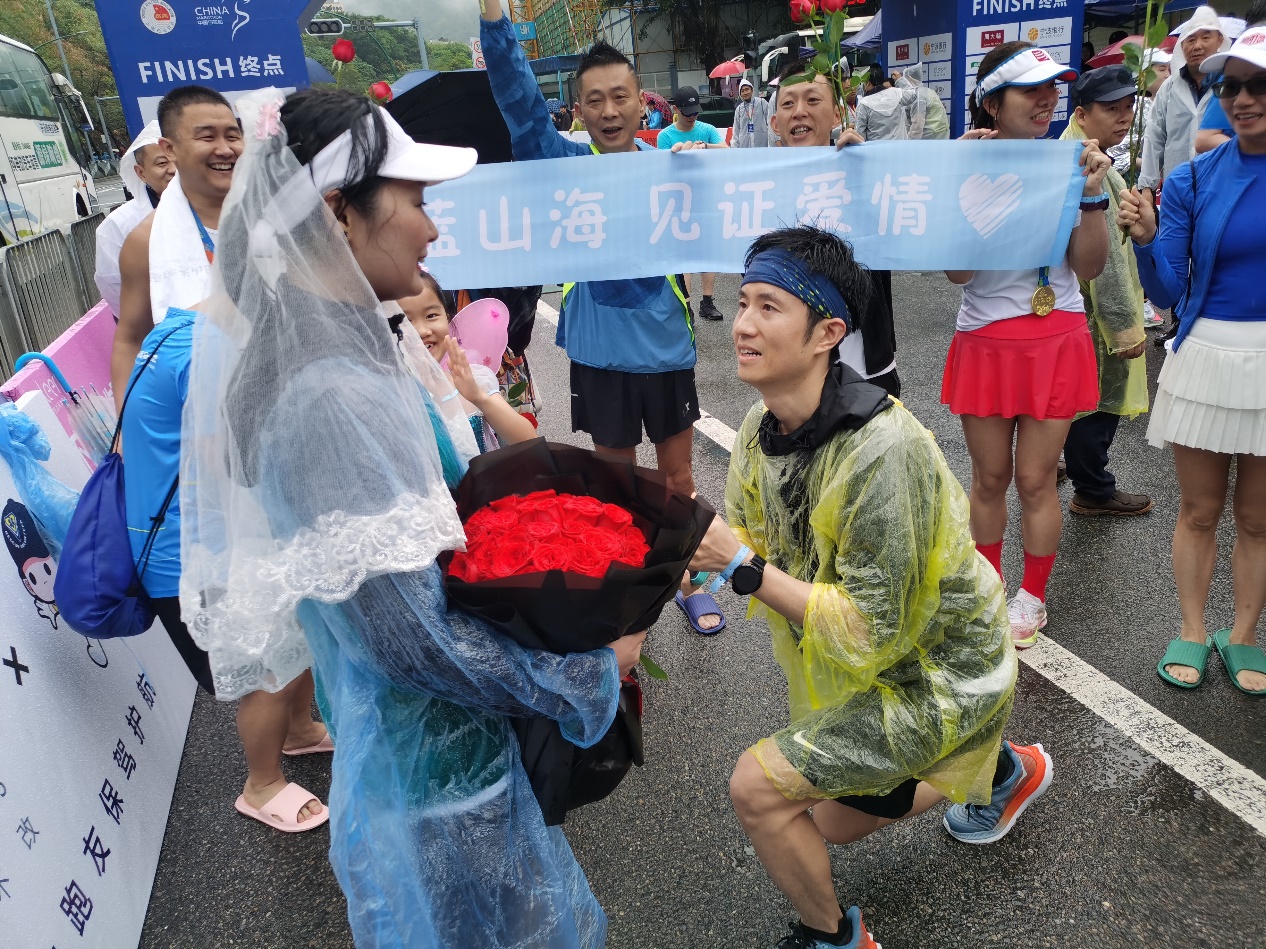 “今天是我们第一次一起跑完‘半马’,这么大的风雨都见过了,我们也没有放弃,人生的其他困难我都不害怕了。”大海边,山脚下,在淅淅沥沥的小雨中,小伙对着另一半大声喊道:“我爱你,嫁给我好吗?”
